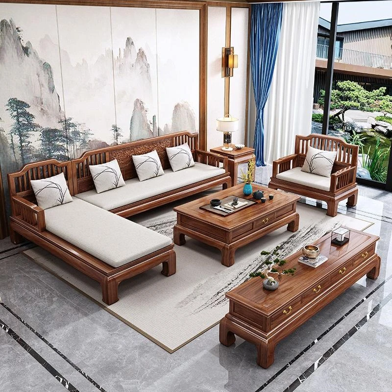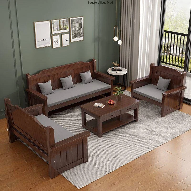 Modern Minimalist Solid Wood Sofa Set for Living Room - All Solid Wood Furniture Combination, Ideal for Small Spaces, Featuring a Chic New Chinese Style and Natural Wood Finish.