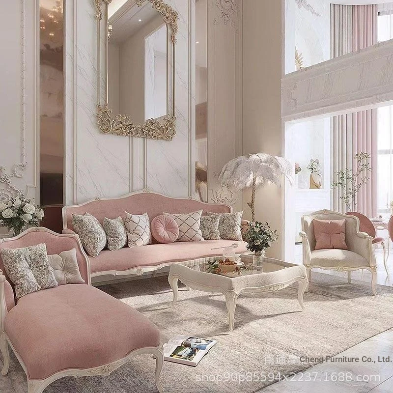 French Elegant Carved Solid Wood Sofa - Princess Style Living Room Set, American Neoclassical 3-Seater & Chaise Lounge Furniture Combo for a Luxurious Home Décor
