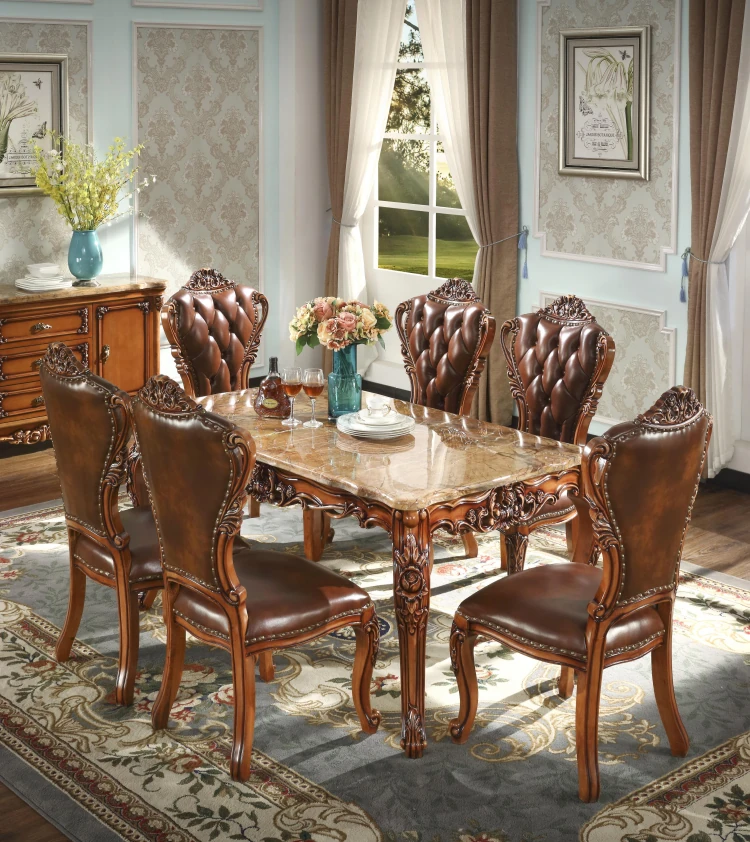 Elegant European Marble Dining Table and Chair Set - Luxury Solid Wood Carved 2m/2.2m Dining Table for Villas and High-End Restaurants, Perfect for Home Use