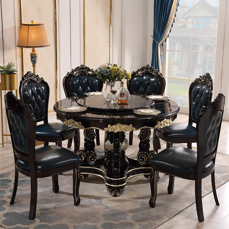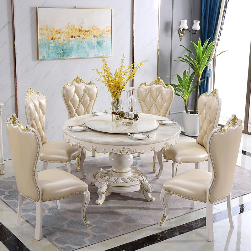 Elegant European Style Marble Round Dining Table Set with Lazy Susan - Luxurious Carved Solid Wood Table for 6-8 People, Perfect for Home Dining Experience