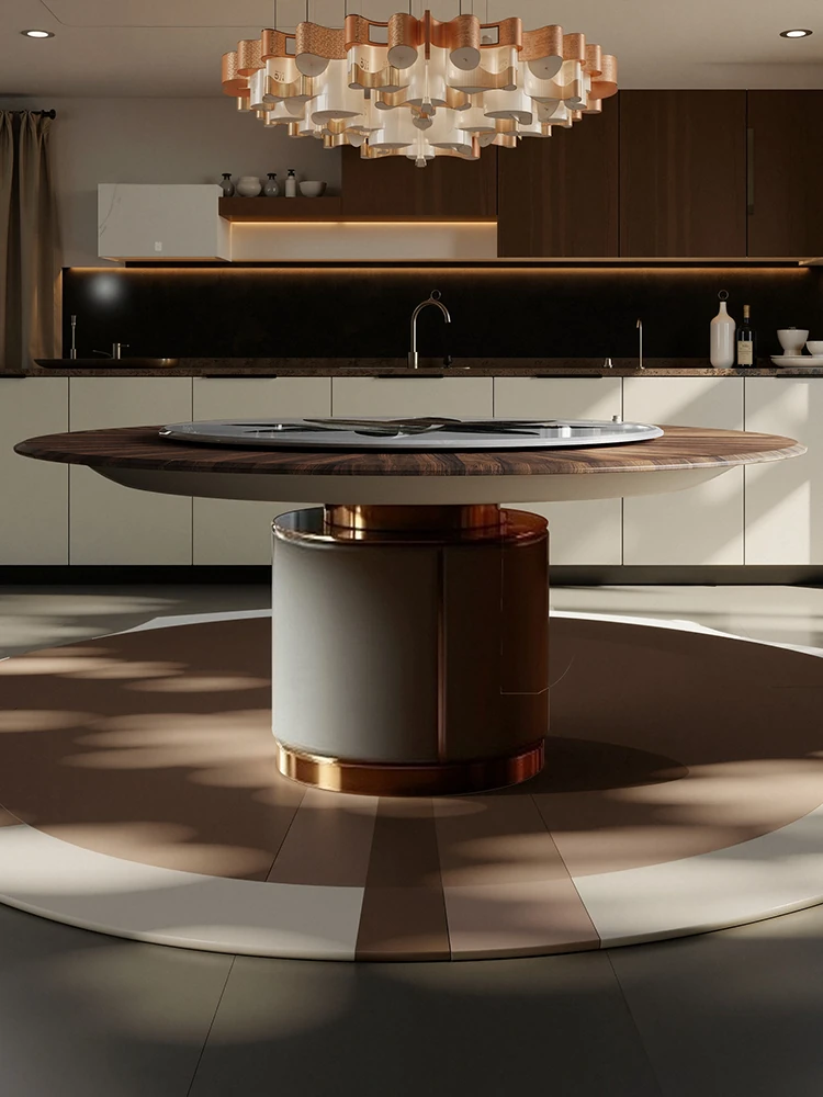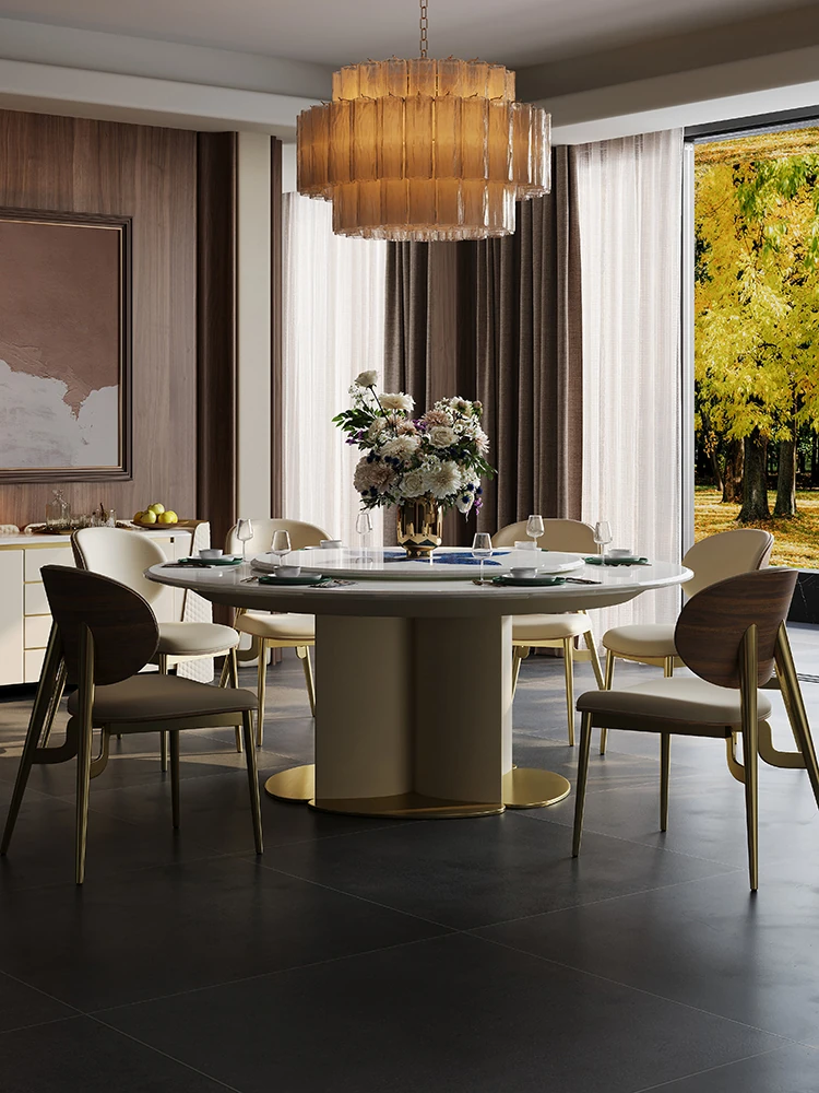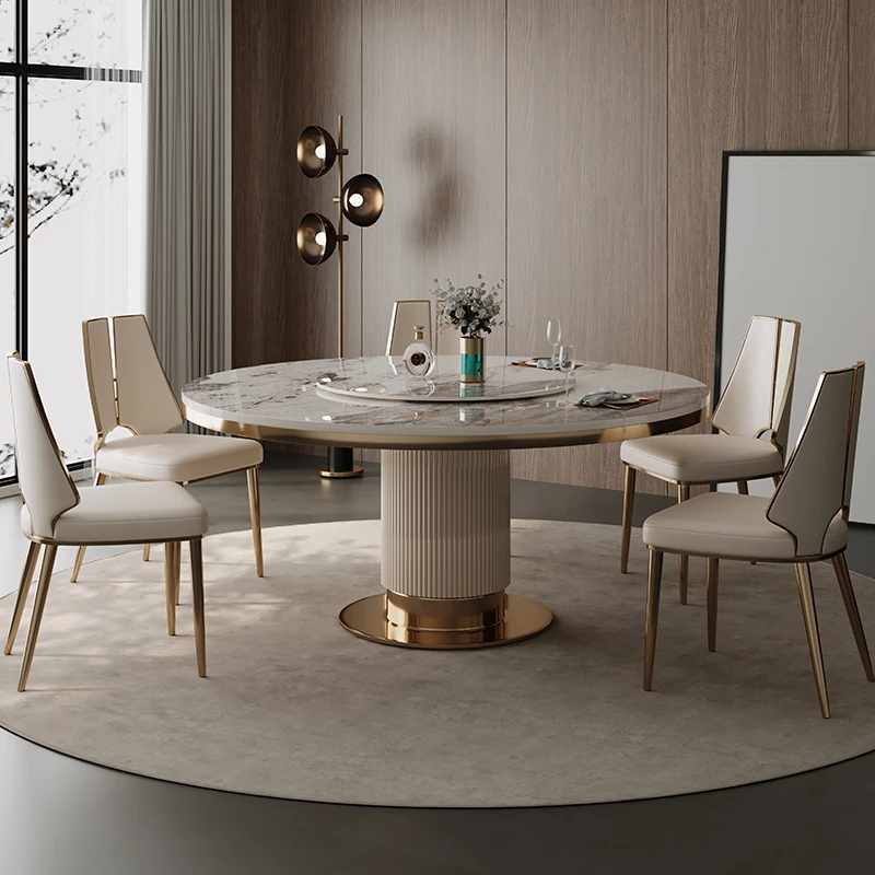 Italian Luxury Style Round Dining Table Set for Small Apartments - Elegant Villa Dining Table with Chairs & Rotating Tray, Perfect for Upscale Living Spaces.