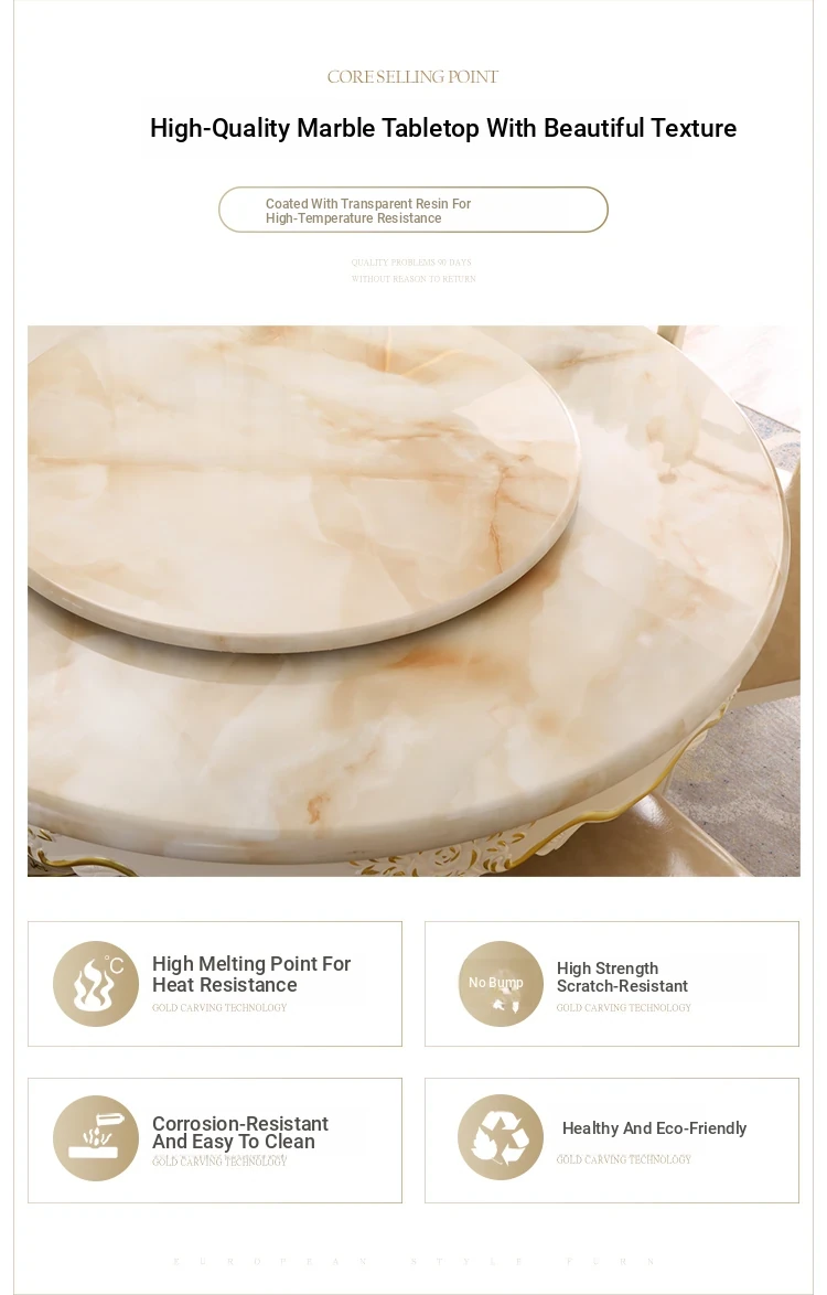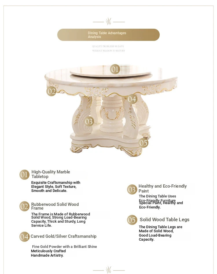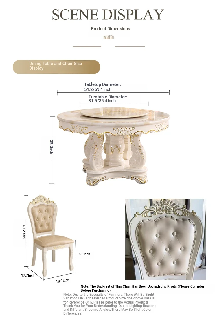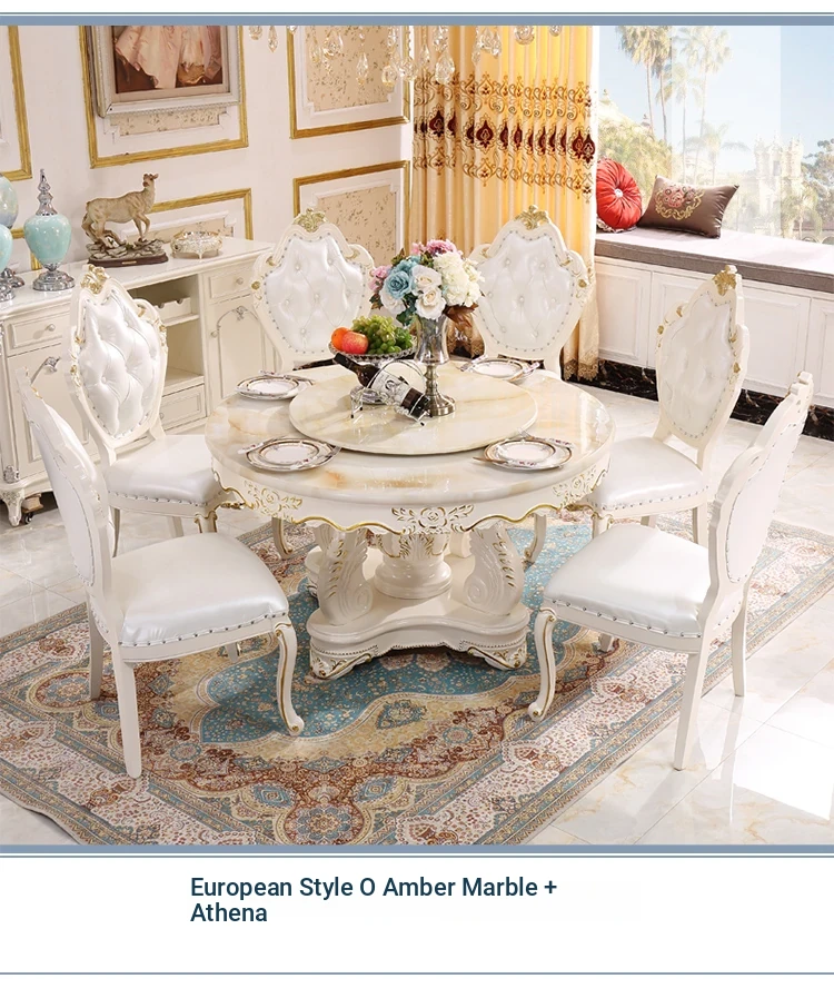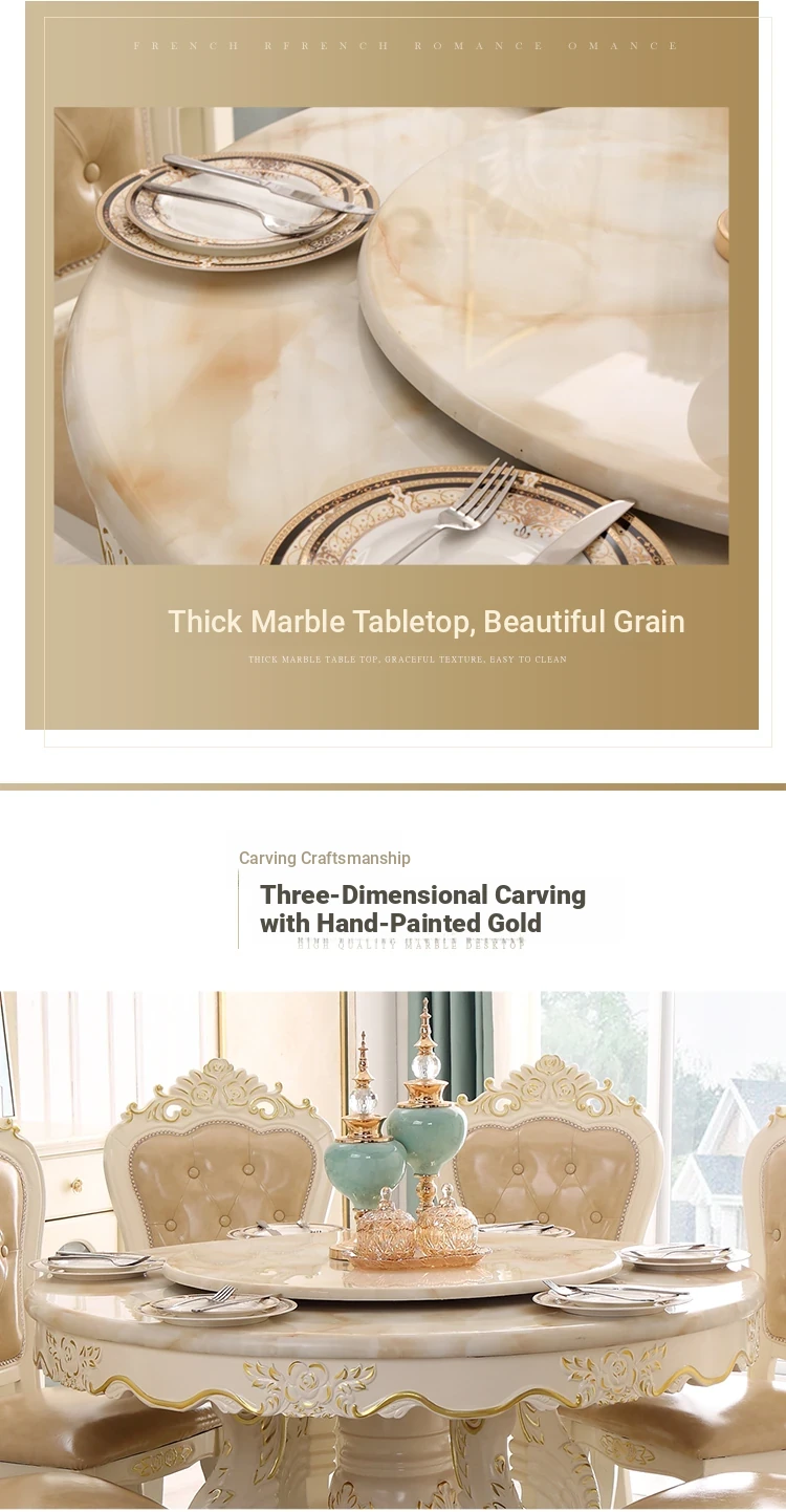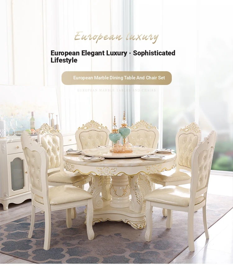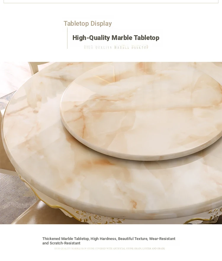 Elegant European Style Marble Round Dining Table Set with Lazy Susan - Luxurious Carved Solid Wood Table for 6-8 People, Perfect for Home Dining Experience