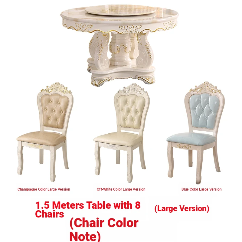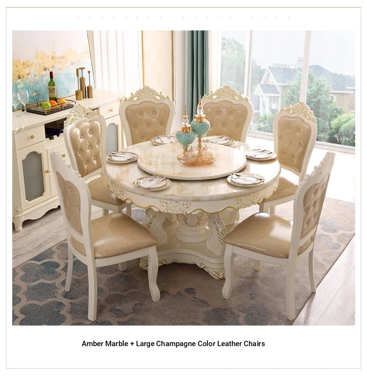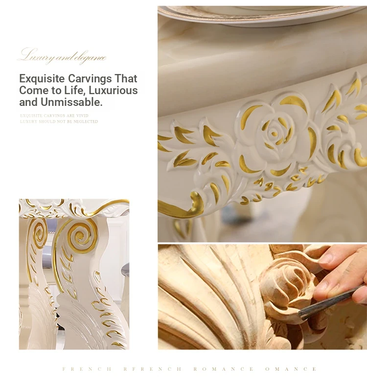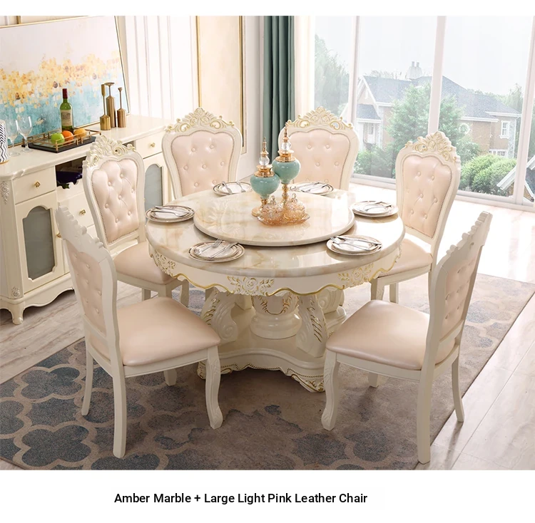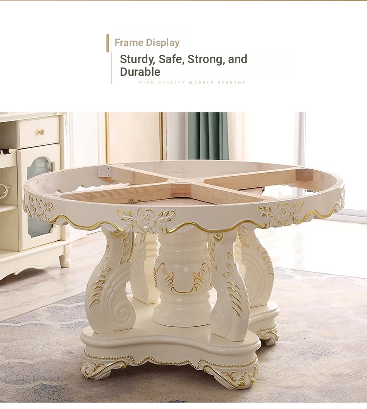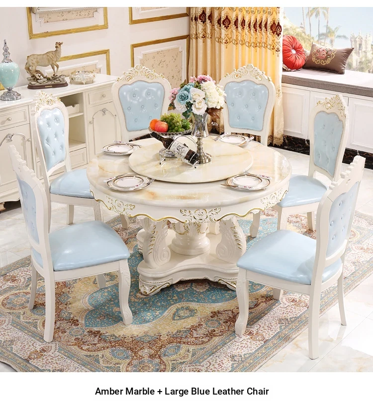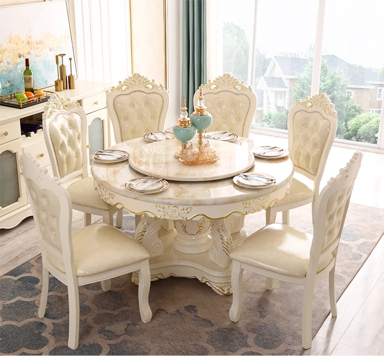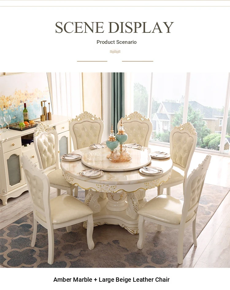Elegant European Style Marble Round Dining Table Set with Lazy Susan - Luxurious Carved Solid Wood Table for 6-8 People, Perfect for Home Dining Experience
