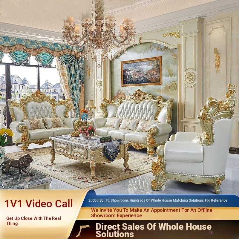Elegant European Style Solid Wood Sofa Set - 123 Combination for American-style Luxury Villas, Featuring High-Quality Top-Grain Leather, Perfect for Spacious Living Rooms. Experience Ultimate Comfort and Sophistication!