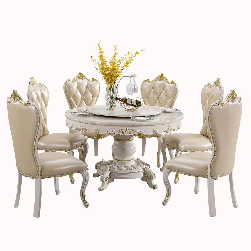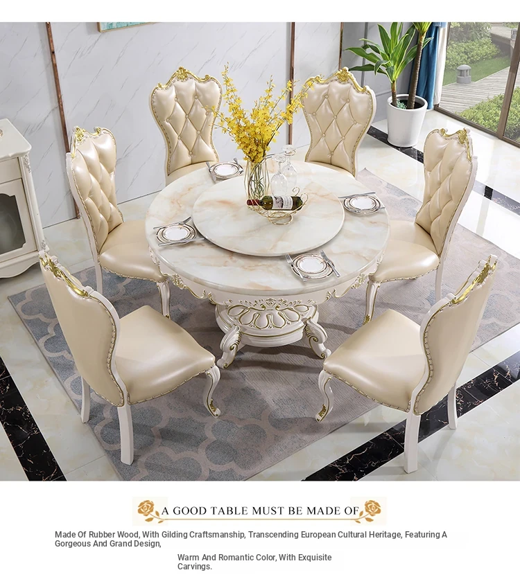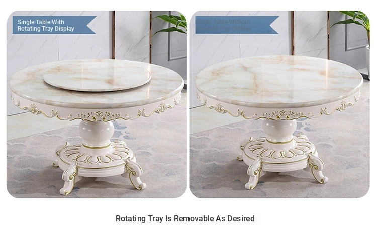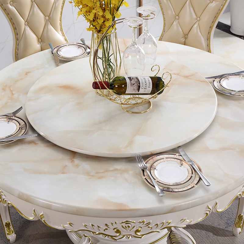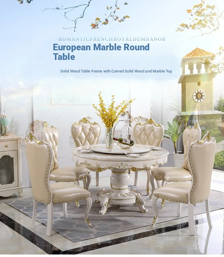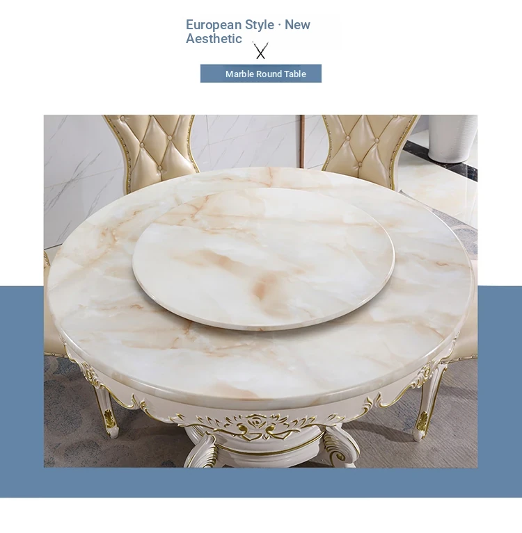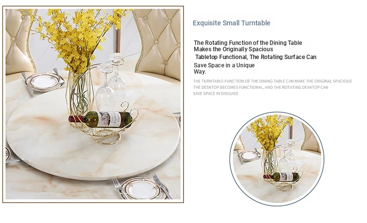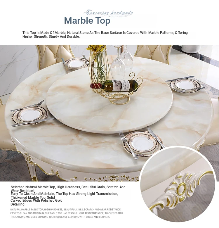 European Style Round Dining Table with Lazy Susan - Marble Top Wooden Table Set for 6 or 8 People - Perfect for Family Meals and Gatherings