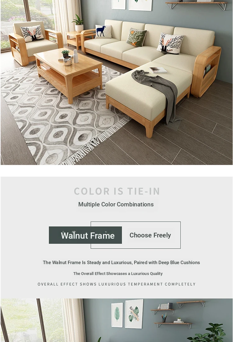 Nordic Solid Wood Sofa Set with Chaise Lounge - Modern Minimalist Design for Small Living Rooms, Made of Durable Rubberwood