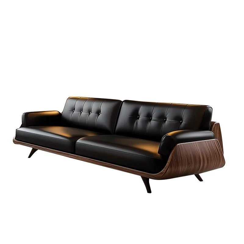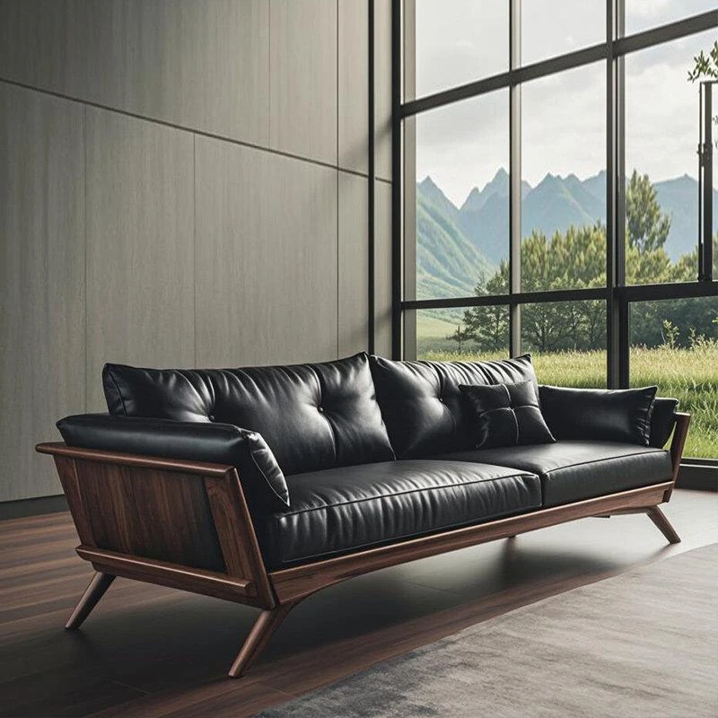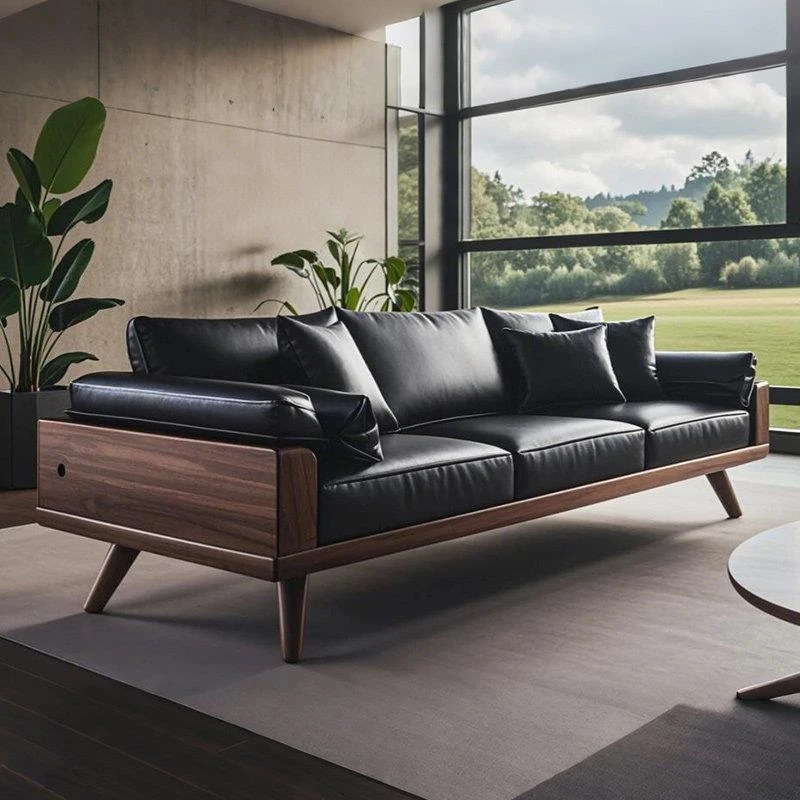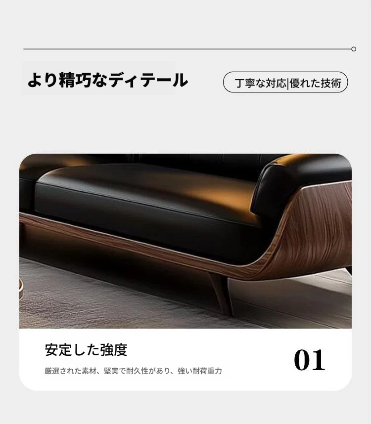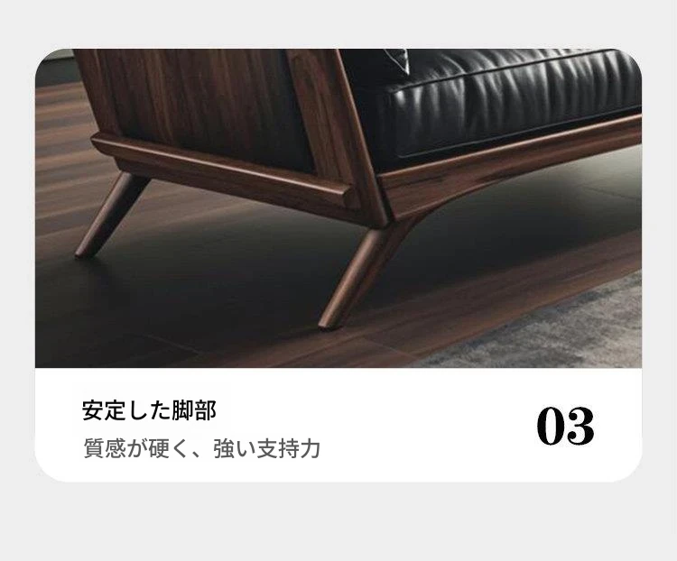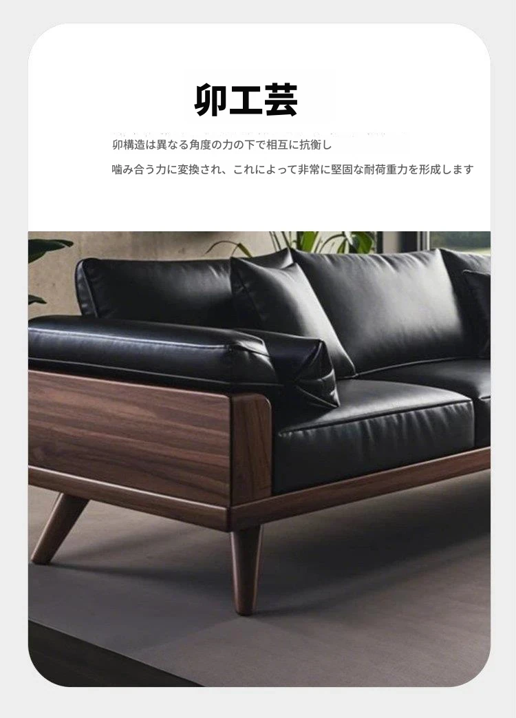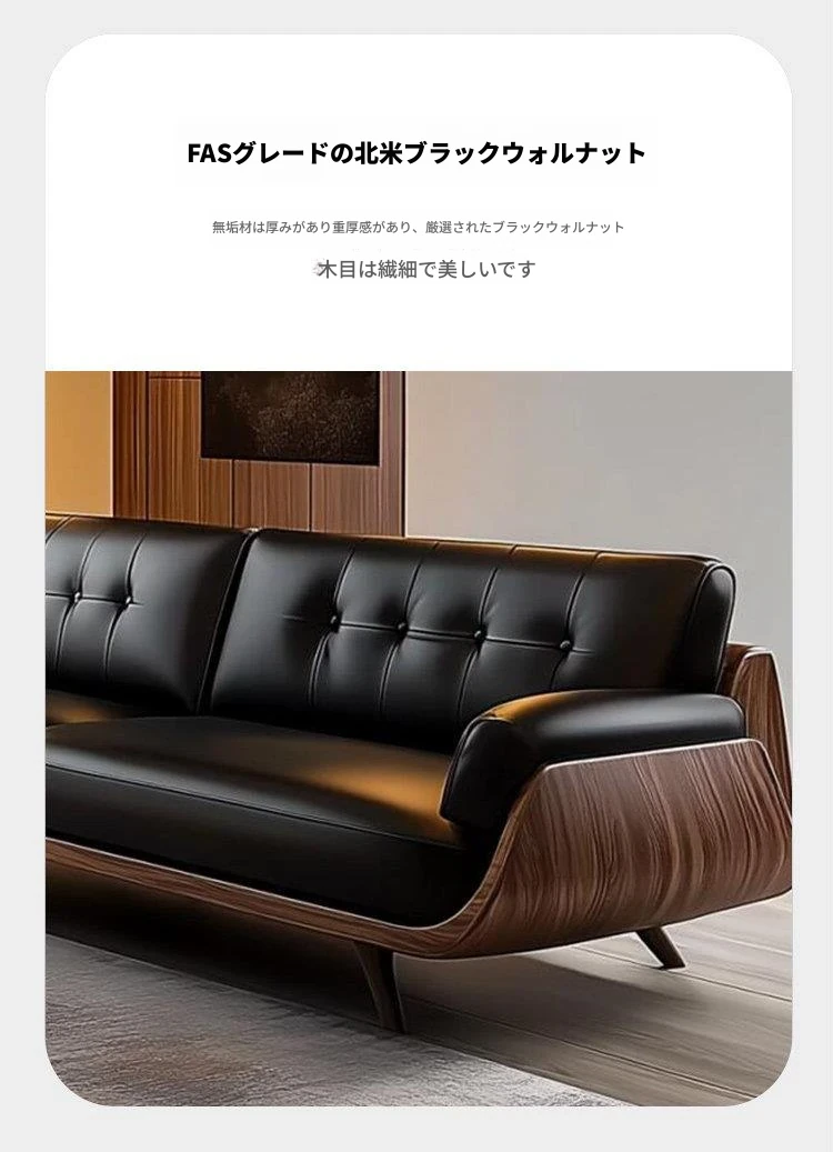 2025年新作!新中式実木ソファー - 高級感あふれる皮革仕上げ、ウォールナット材使用のリビング用三人掛けソファー。洗練されたデザインで、あなたのリビングを格上げします!