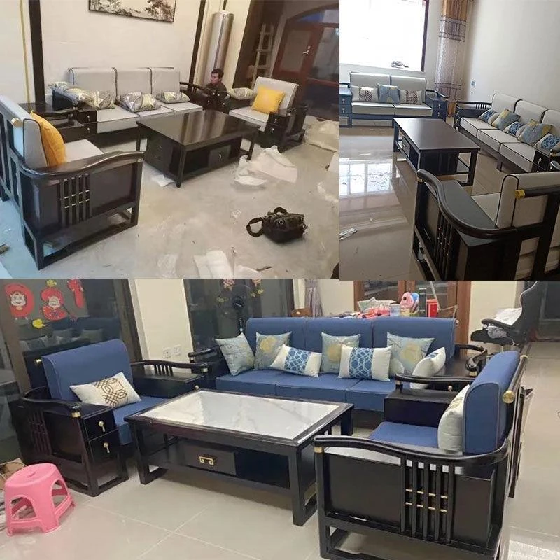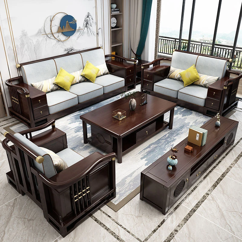 新中式の全木製ソファセット - 大型リビングルームに最適!豪華でスタイリッシュなデザイン、田舎の別荘にもぴったりな温かみのある木製ソファ。居心地の良い空間を演出します!