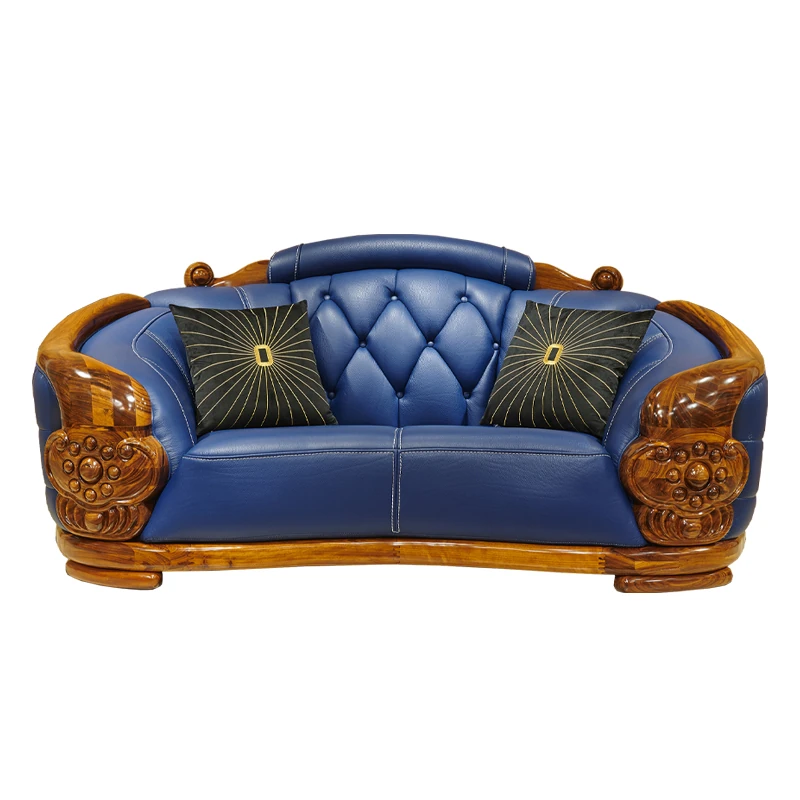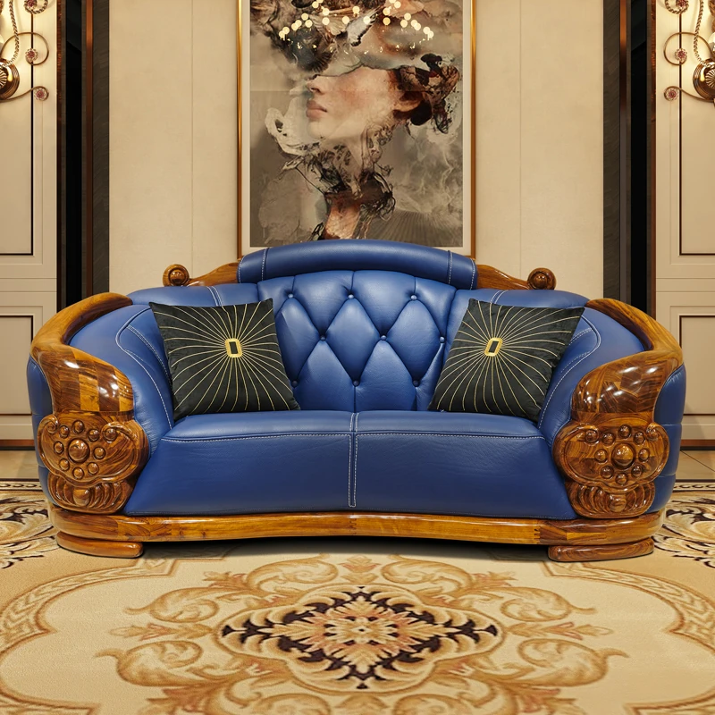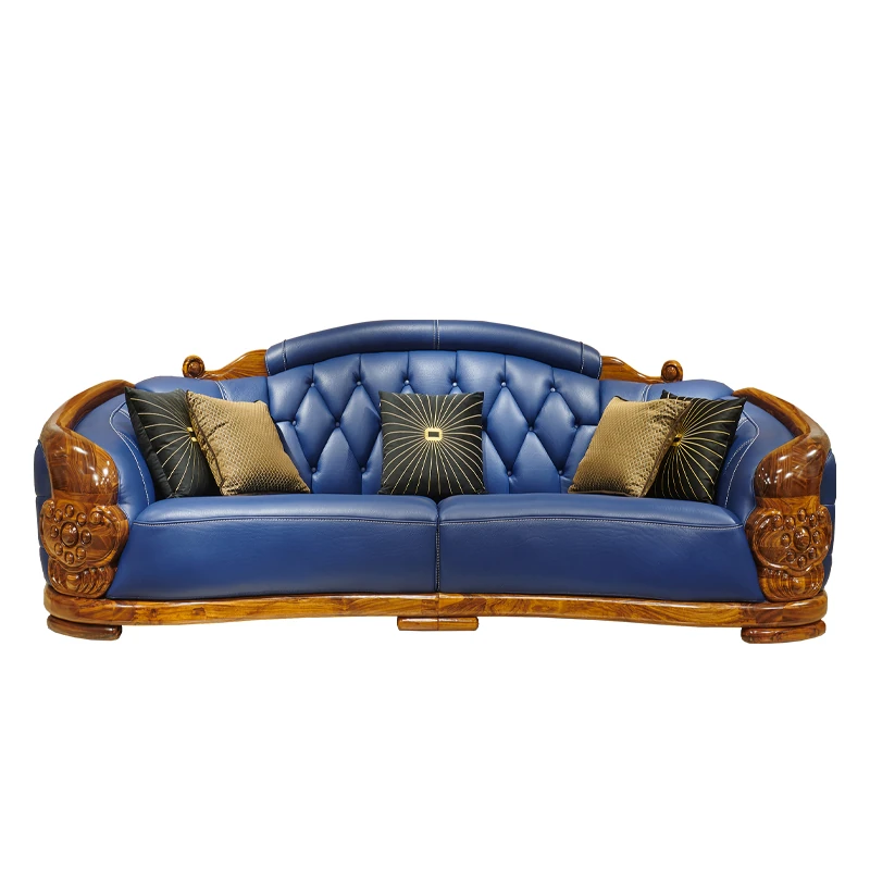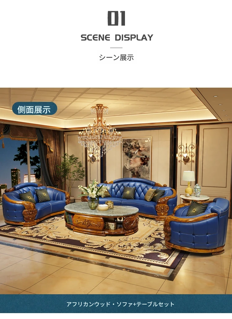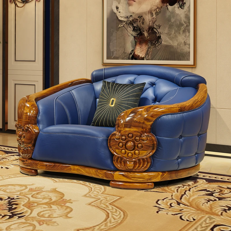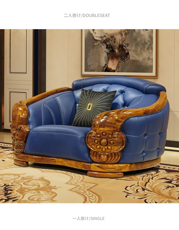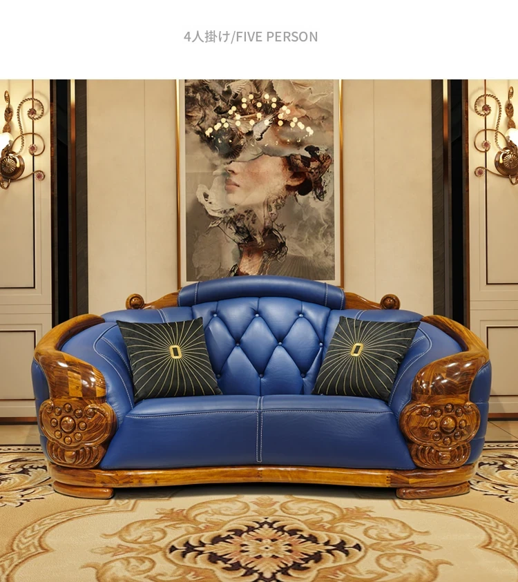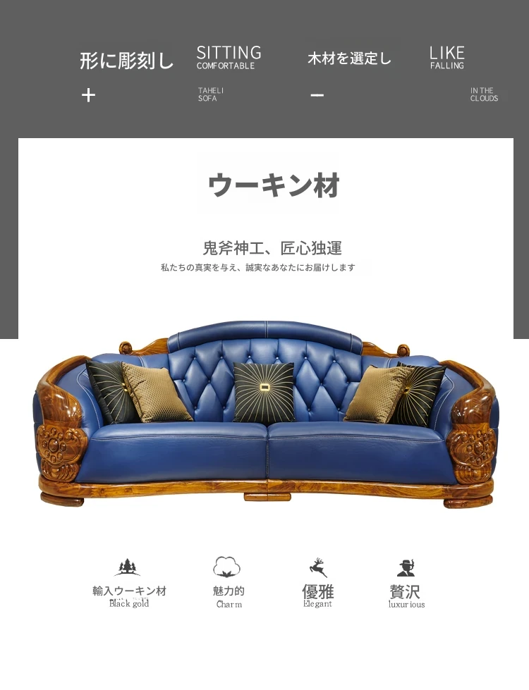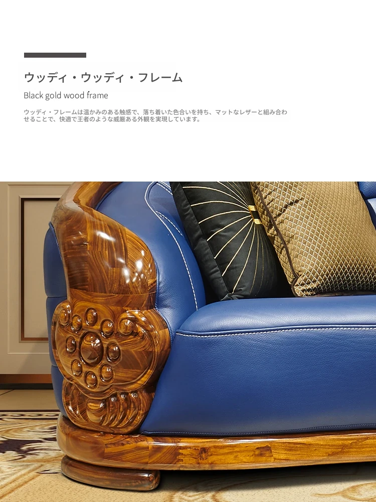 ラッキーウッドブラックウッドソファ 欧風本革リビングルーム 大型ソファセット アメリカンスタイル別荘用フルウッドソファで、優雅なデザインと快適な座り心地を実現!