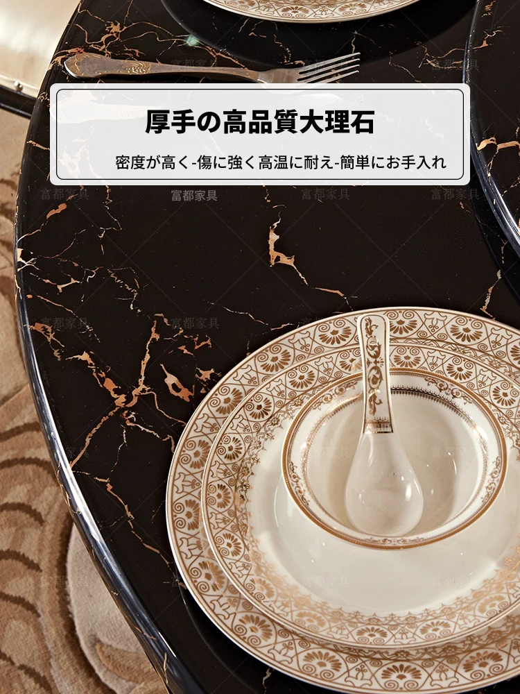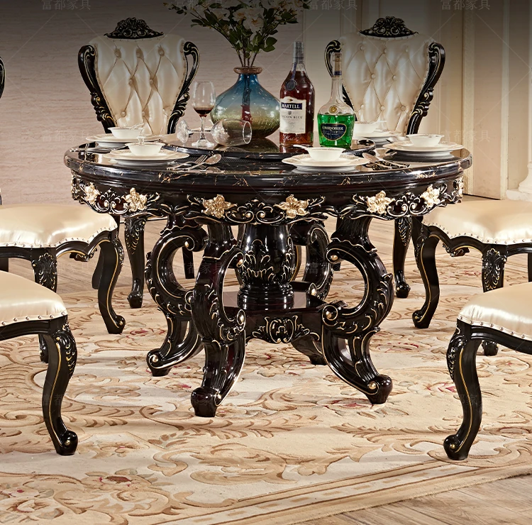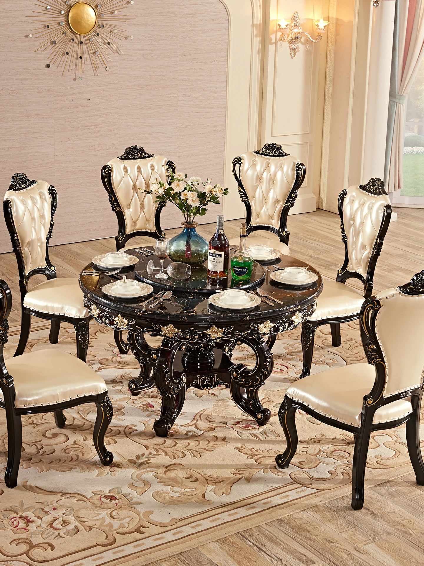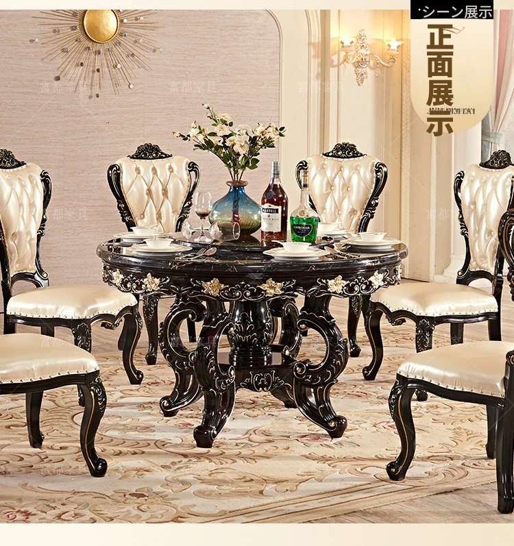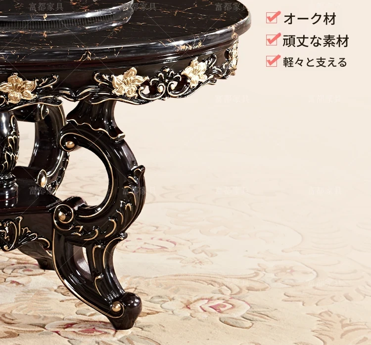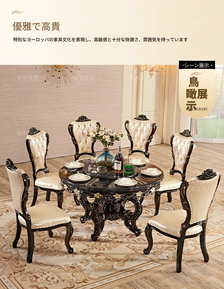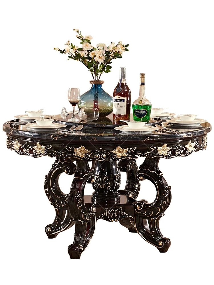 エレガントな欧風大理石ダイニングテーブルセット - 高級全木彫刻のラウンドテーブル、エボニー色、回転トレイ付き。家庭での食事を特別なひとときに演出します!