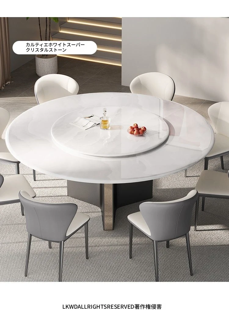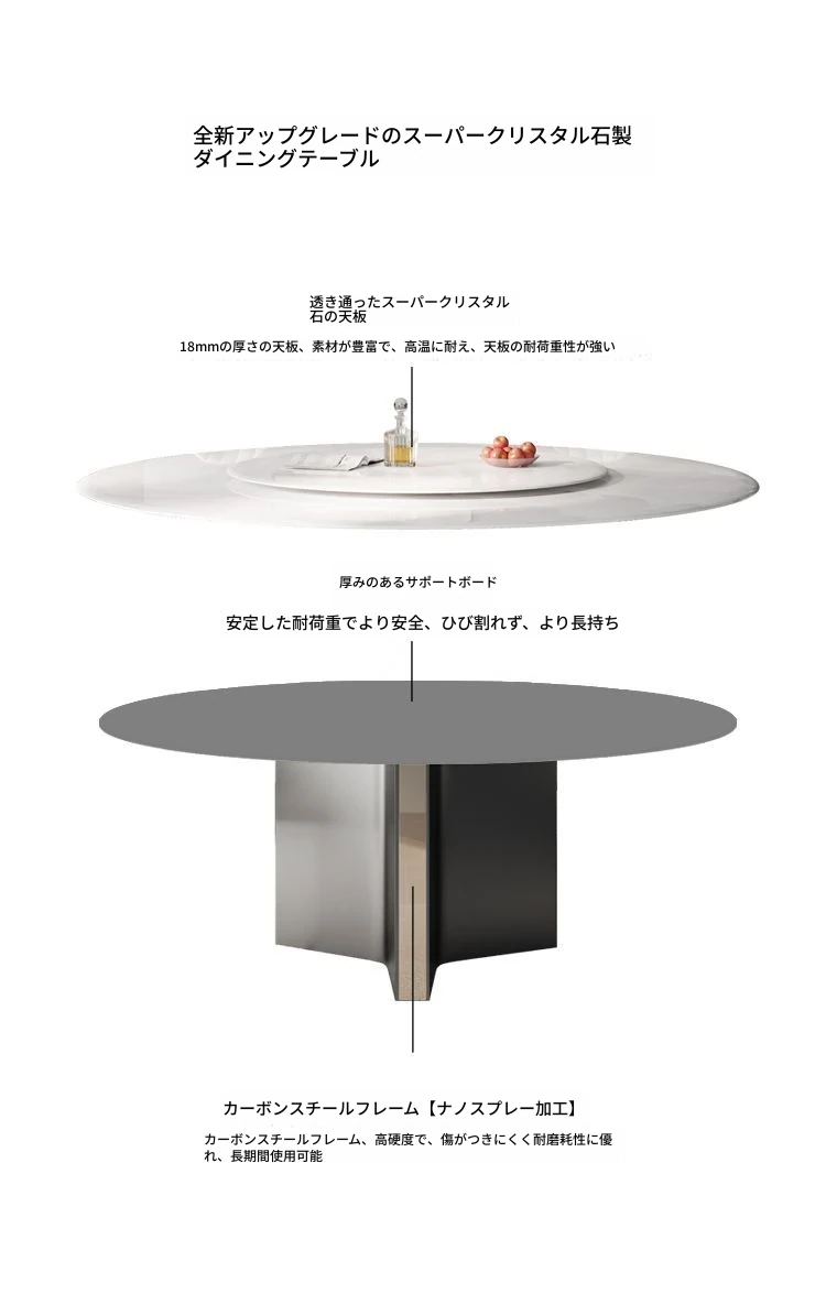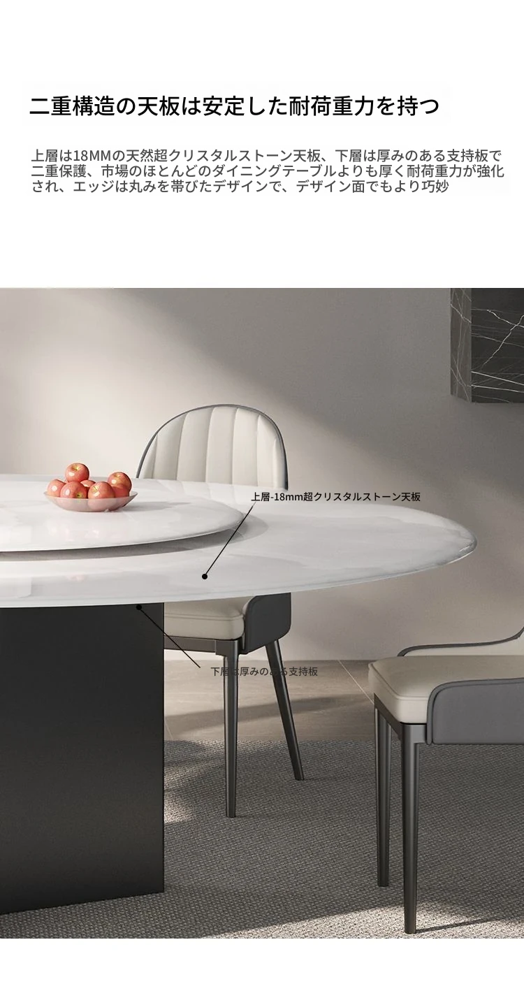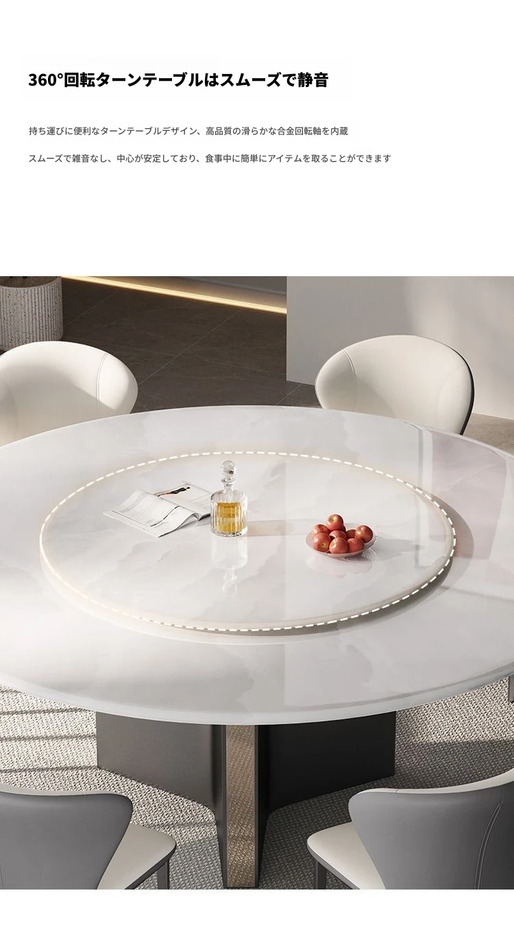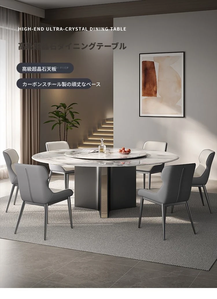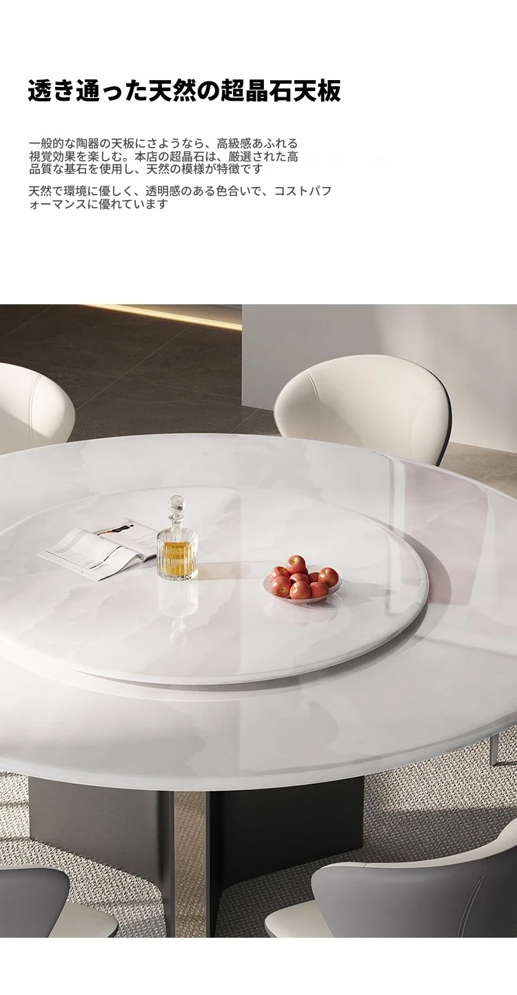 軽やかな贅沢を楽しむ!天然ミクロクリスタルストーン使用、コンパクトサイズのラウンドダイニングテーブル。ターンテーブル付きで、家族や友人との食事をもっと楽しく!小さな空間にもぴったりなデザインです。