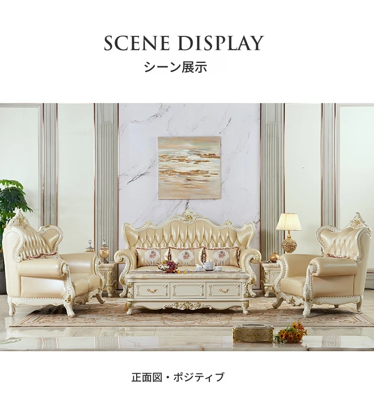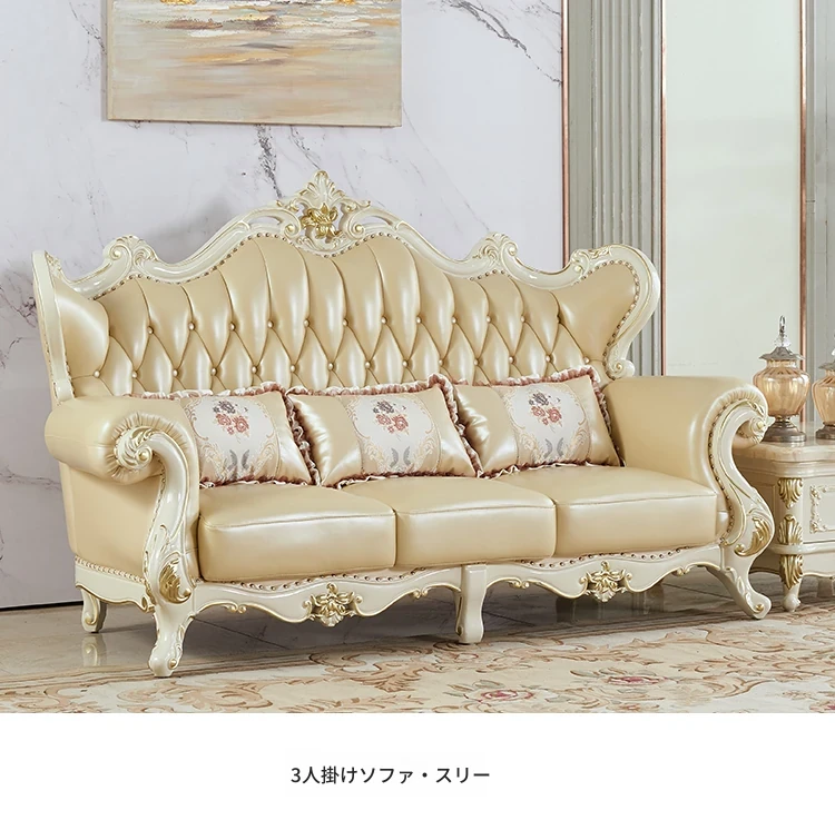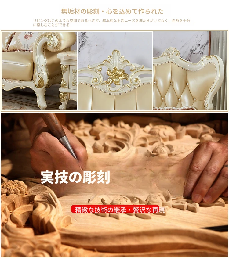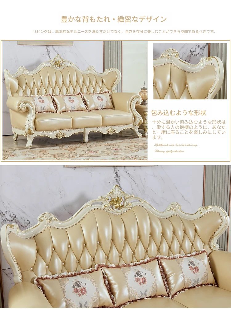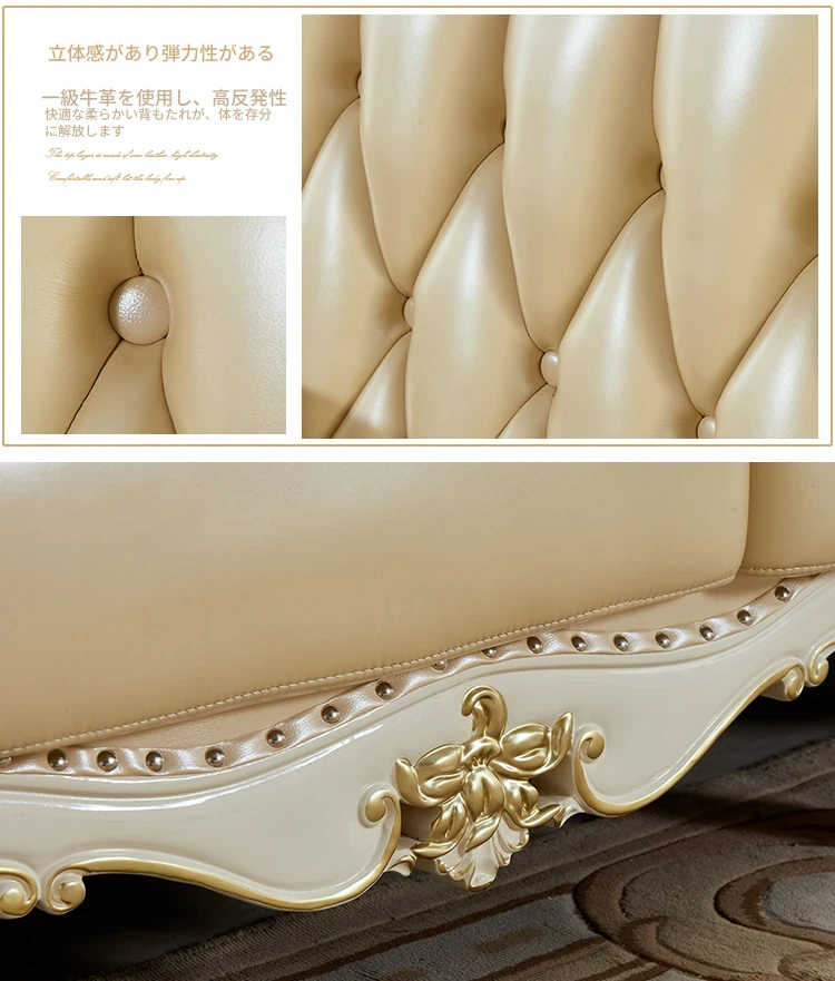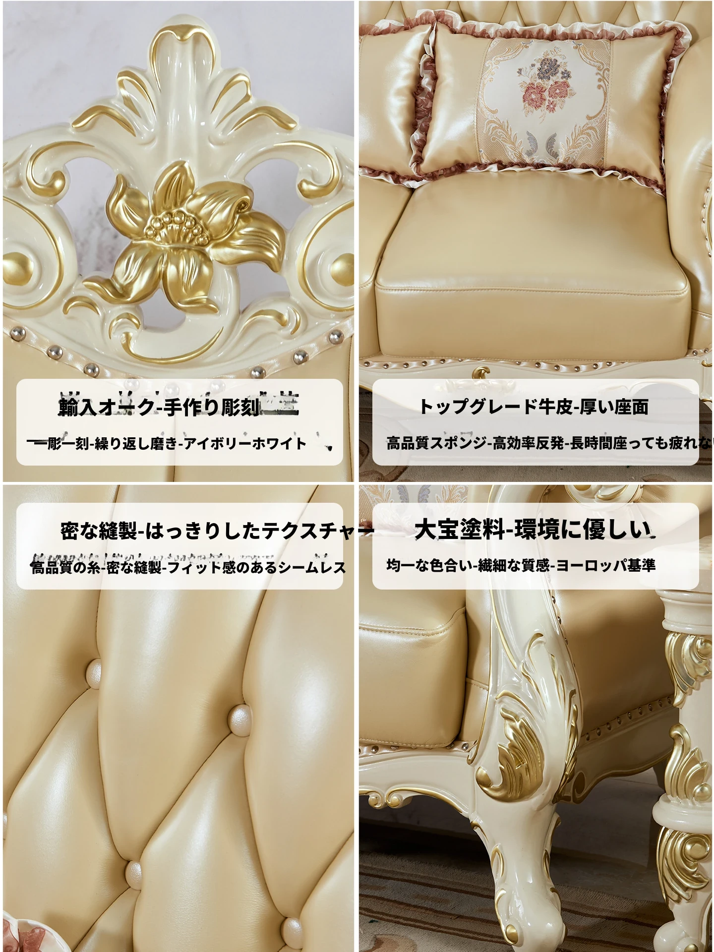 欧風ラグジュアリー本革ソファセット|高級感溢れるウッド彫刻デザイン|シンプルなヨーロッパスタイル|アイボリーホワイトのヴィラリビングにぴったりな高級家具