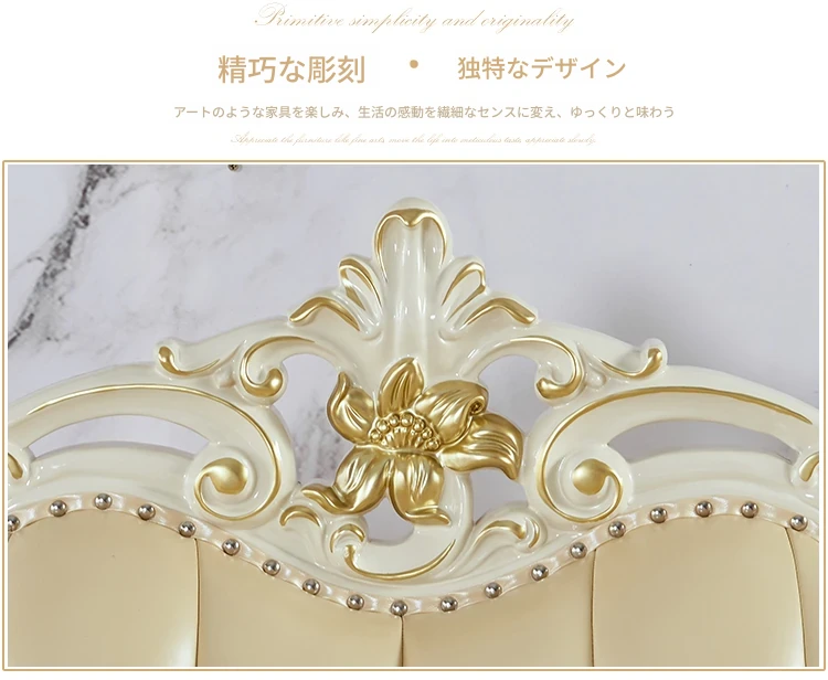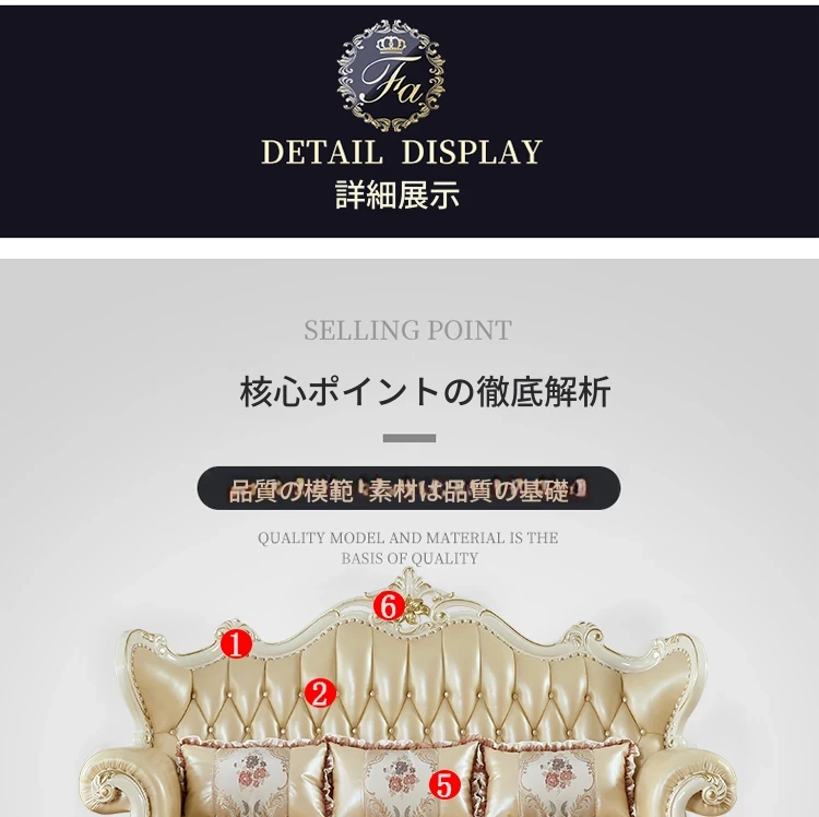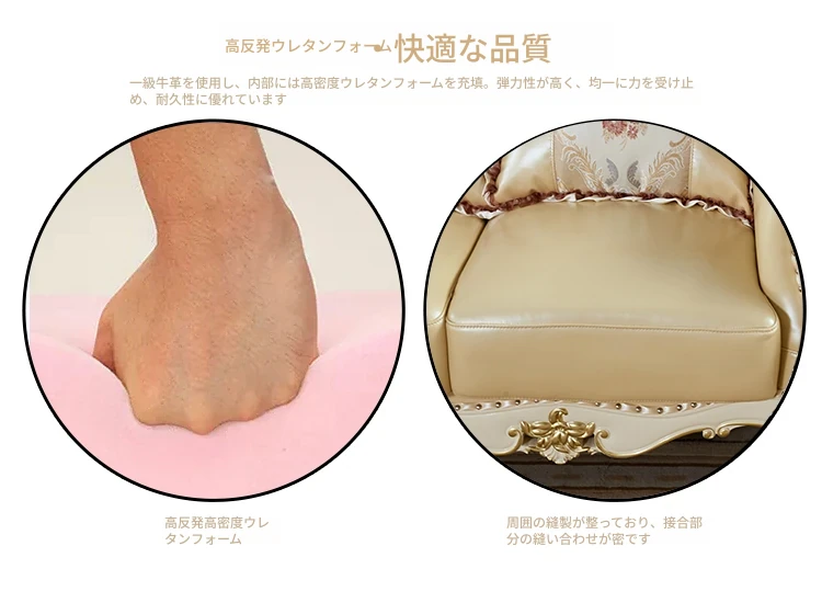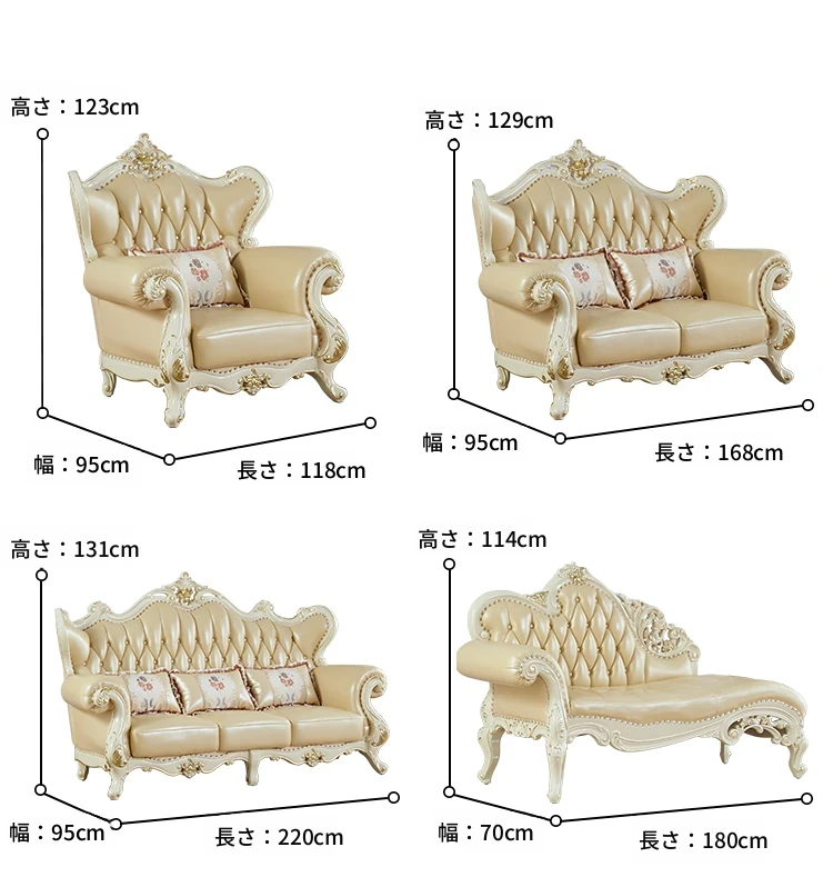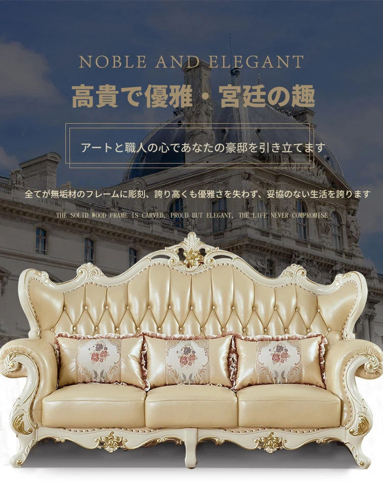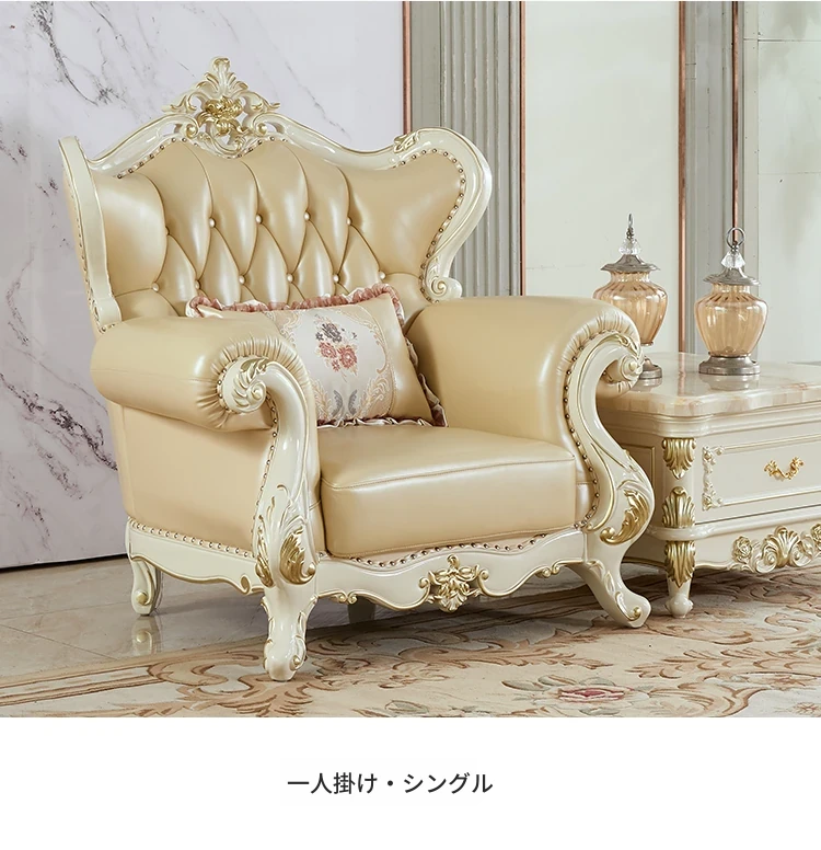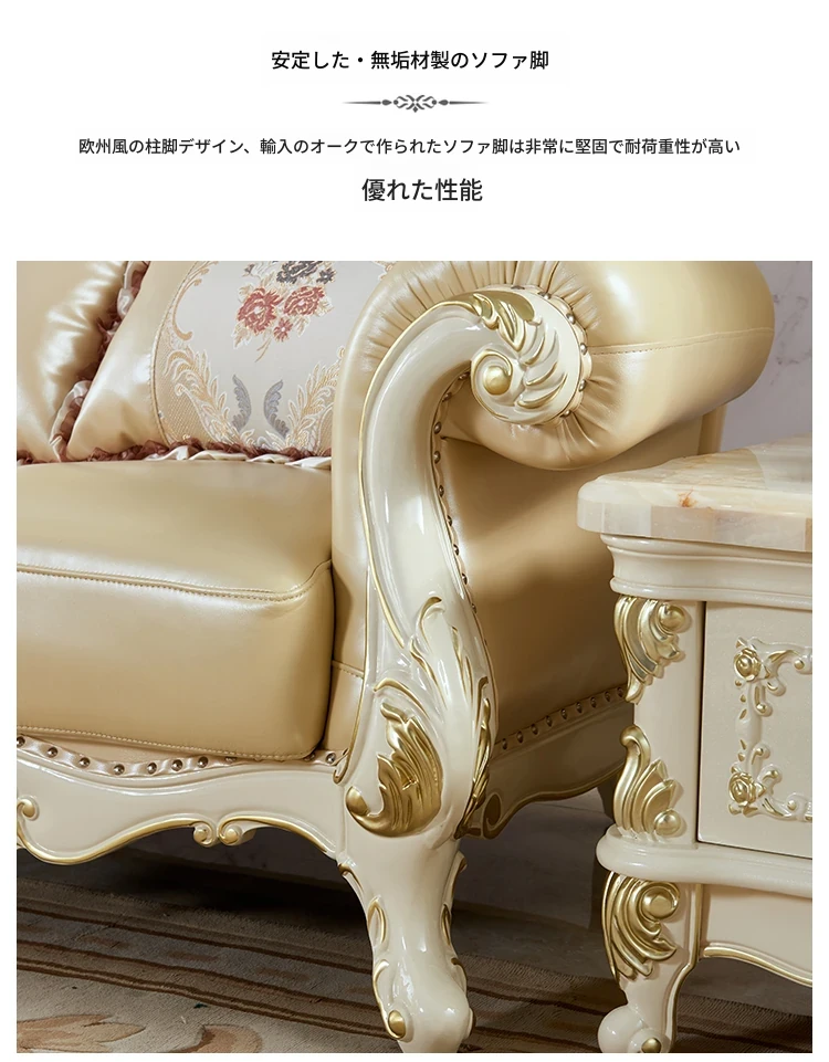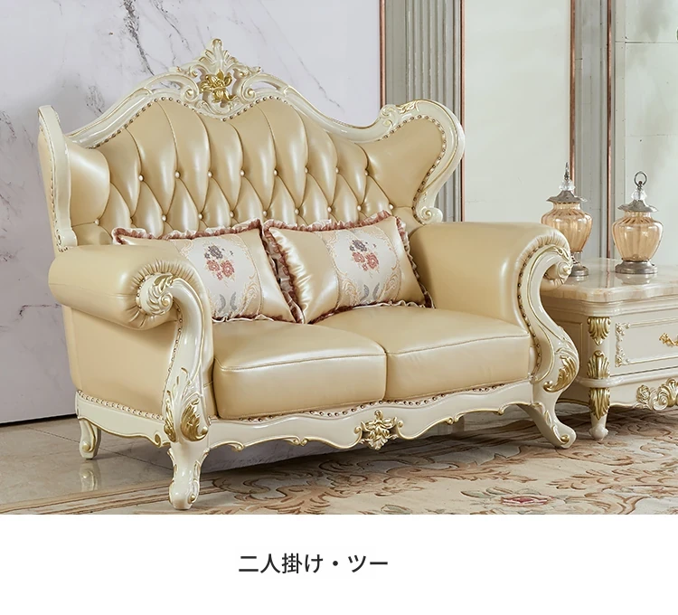 欧風ラグジュアリー本革ソファセット|高級感溢れるウッド彫刻デザイン|シンプルなヨーロッパスタイル|アイボリーホワイトのヴィラリビングにぴったりな高級家具