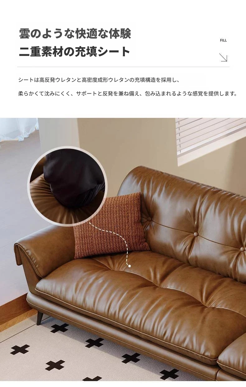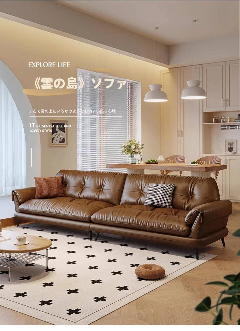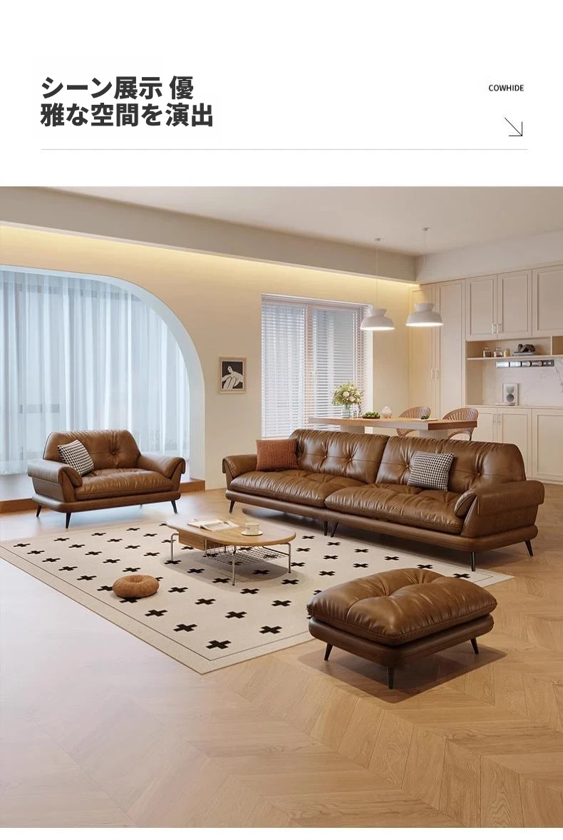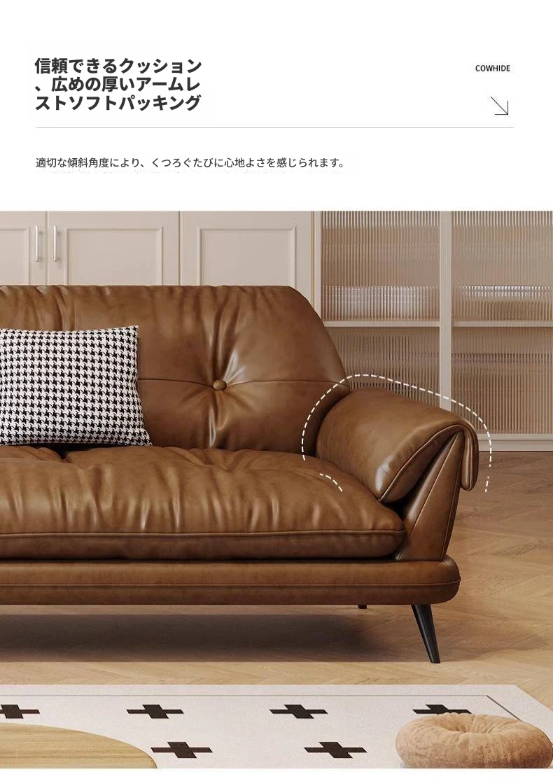 イタリアンミニマリズム本革ソファ - ブラウンのシンプルでレトロなデザイン、アメリカンモダンスタイルのリビングにぴったり!小さな部屋でも映える牛革製の直線的なフォルムで、洗練された空間を演出します。