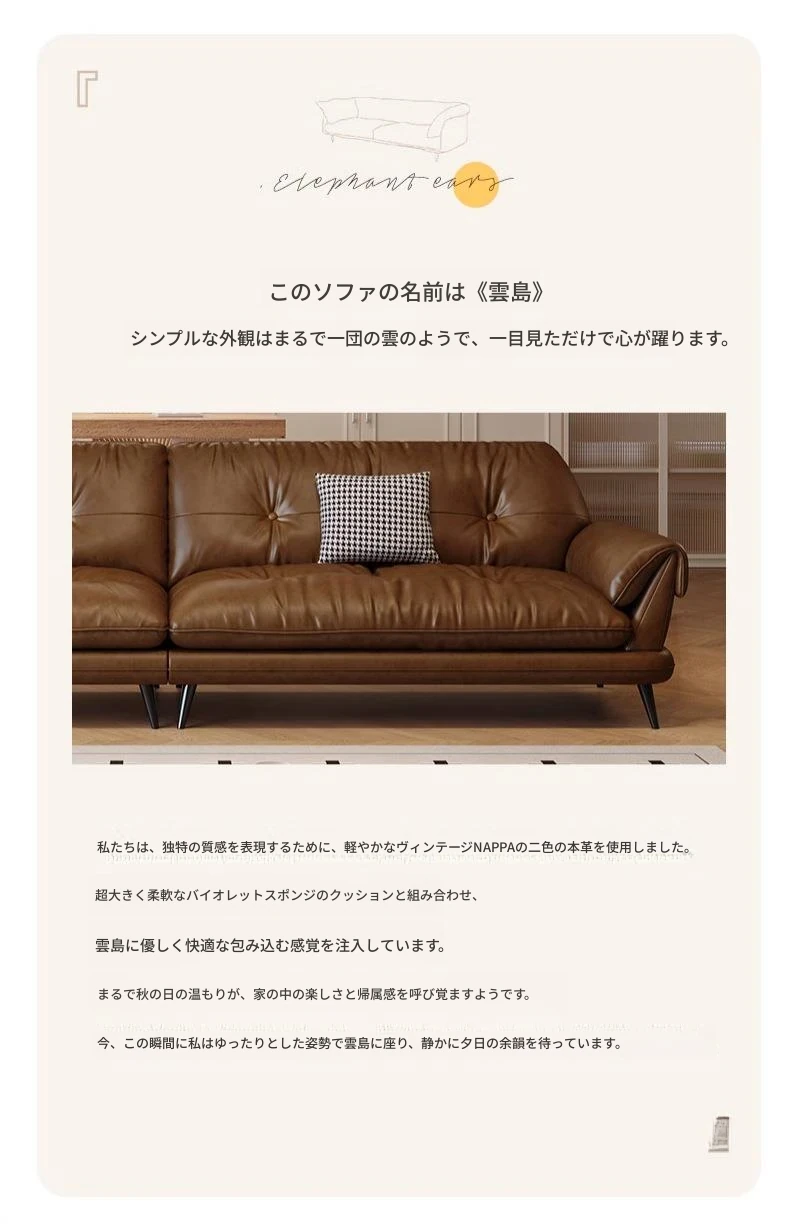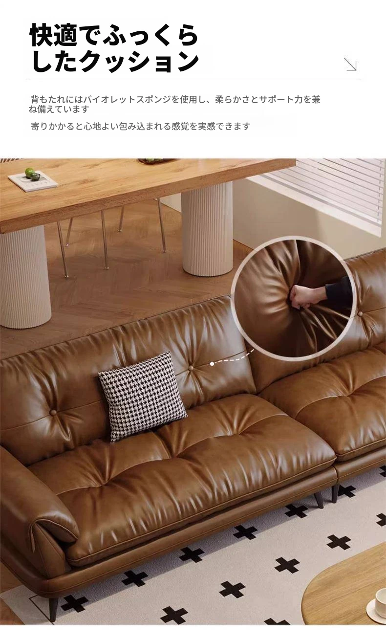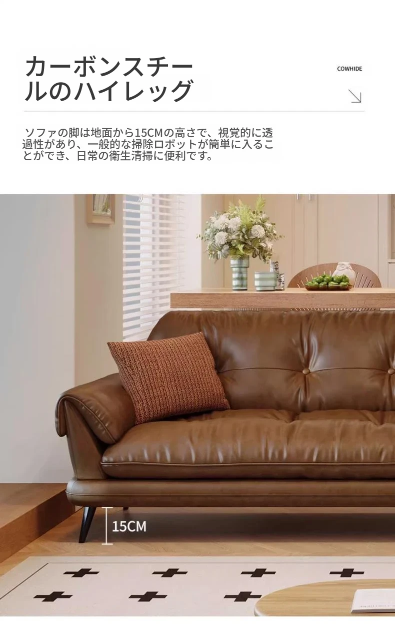 イタリアンミニマリズム本革ソファ - ブラウンのシンプルでレトロなデザイン、アメリカンモダンスタイルのリビングにぴったり!小さな部屋でも映える牛革製の直線的なフォルムで、洗練された空間を演出します。