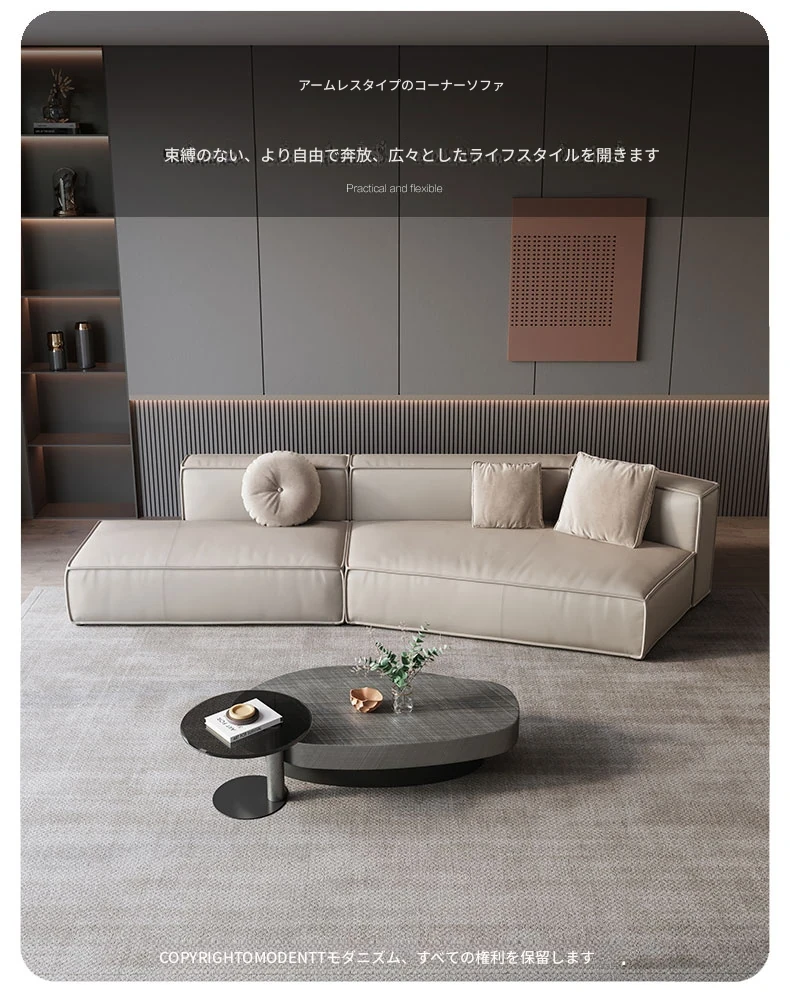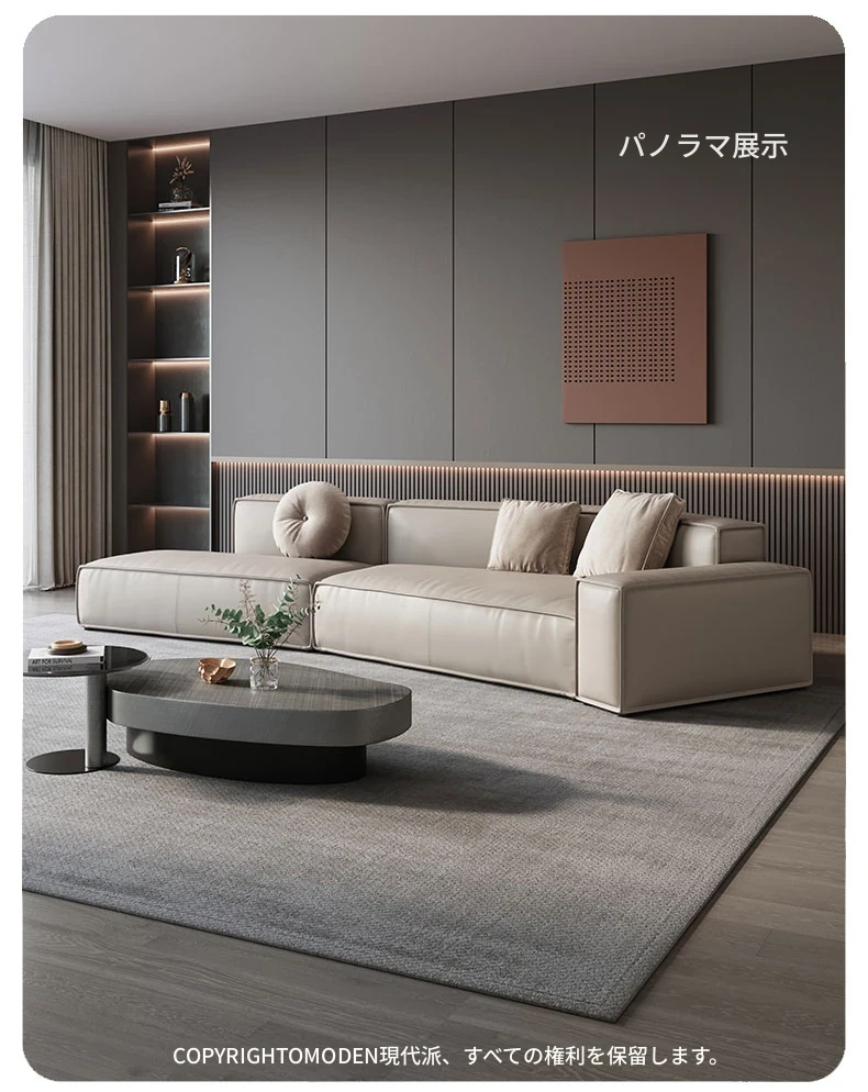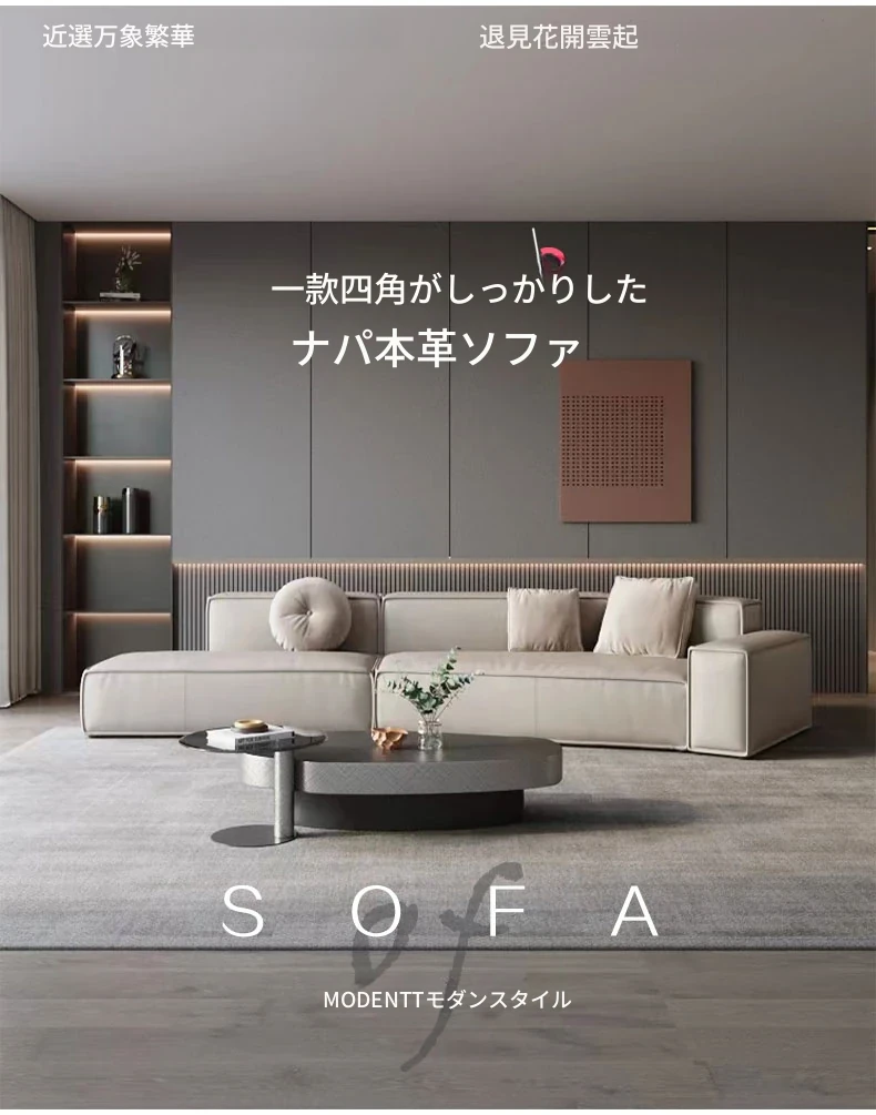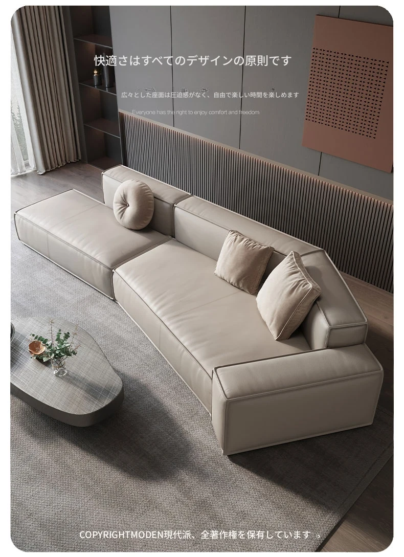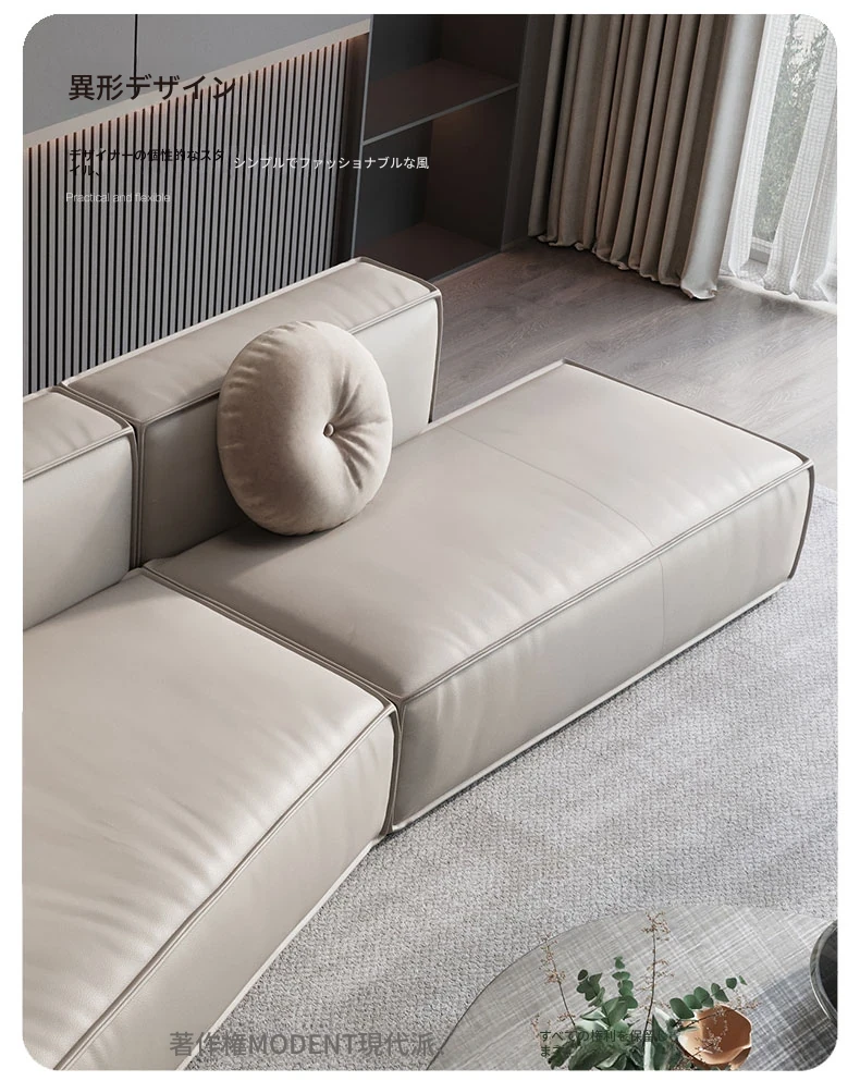 イタリアンミニマリズム本革ソファ - モダンなリビングにぴったりのシンプルデザイン!デザイナーによるユニークなL字型&斜角トーフブロックで、スタイリッシュな会話スペースを演出します。