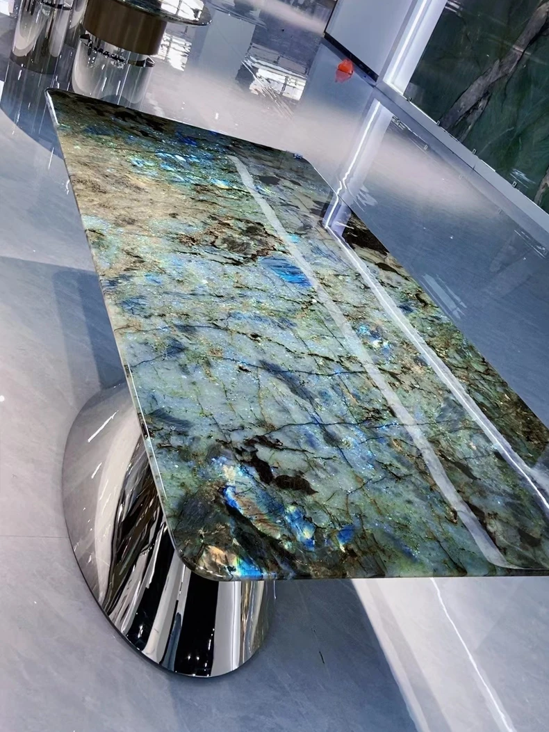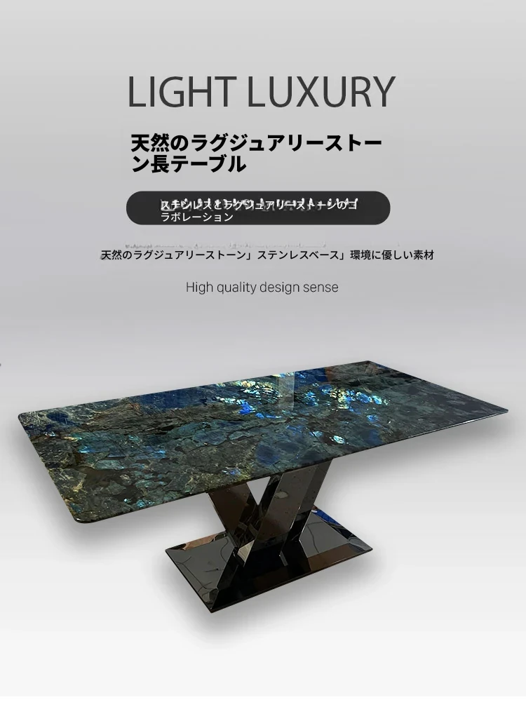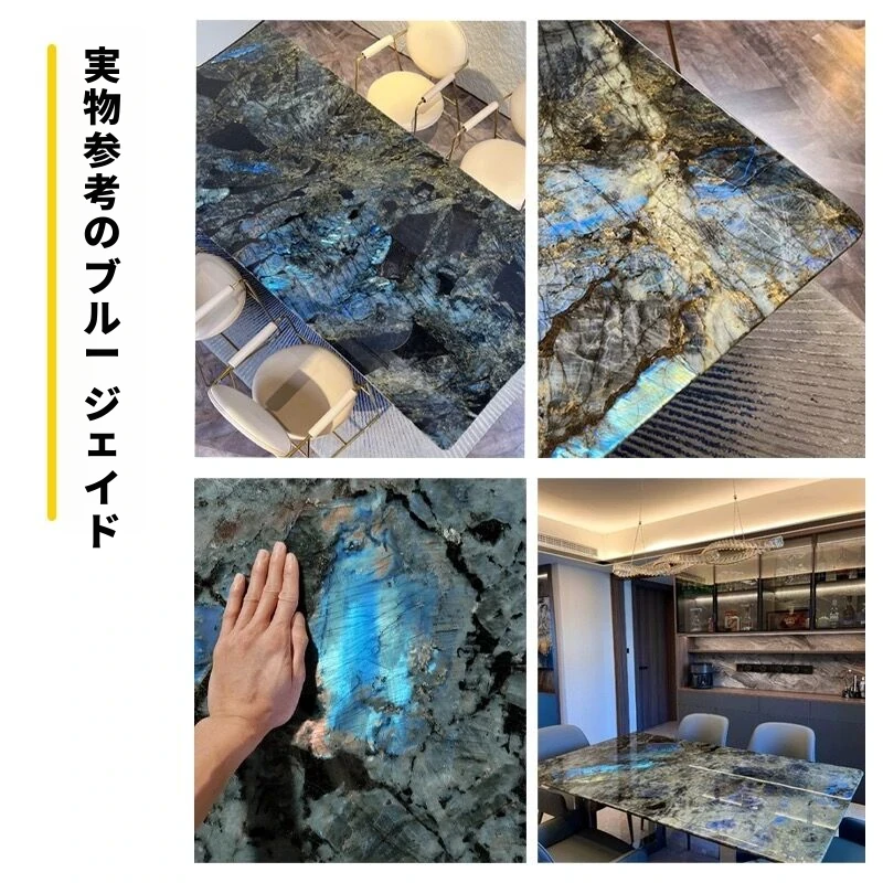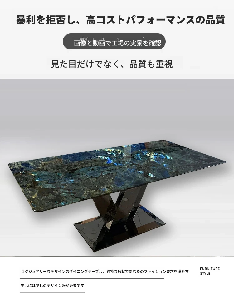 高級感あふれるブルージェイド大理石ダイニングテーブル - インポート天然石使用、デザイナーによる豪華なデザイン、ラグジュアリーな空間を演出する軽やかな高級ダイニングテーブル。