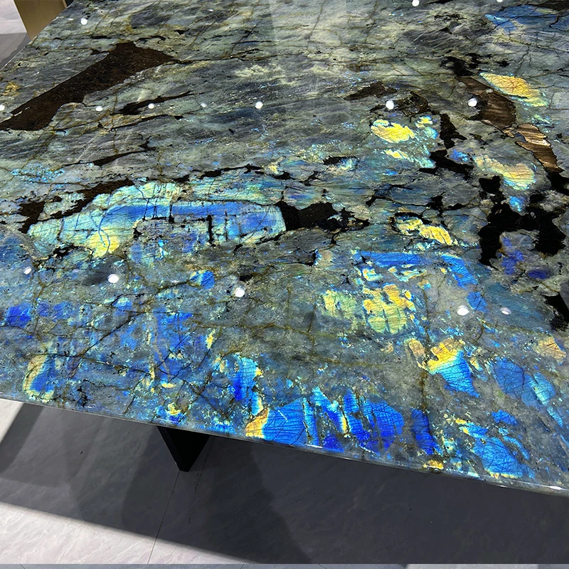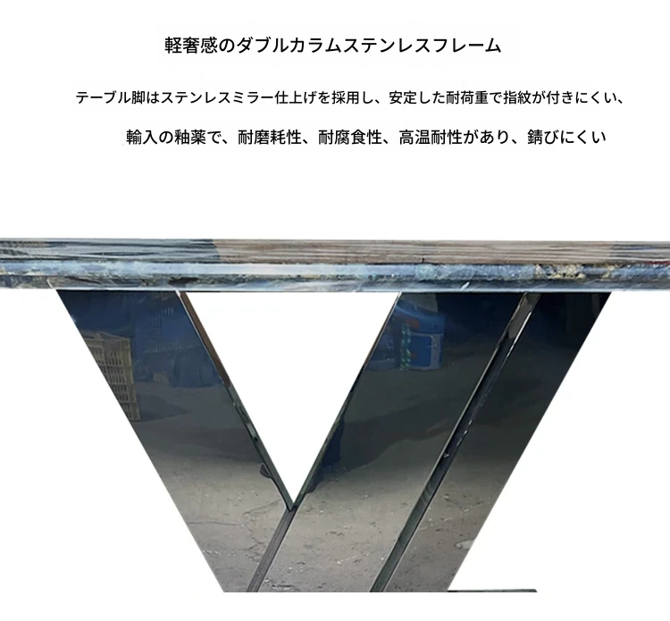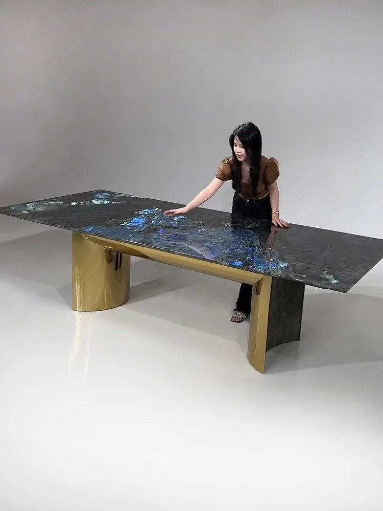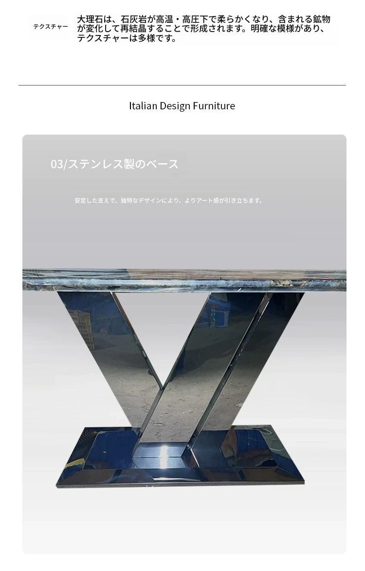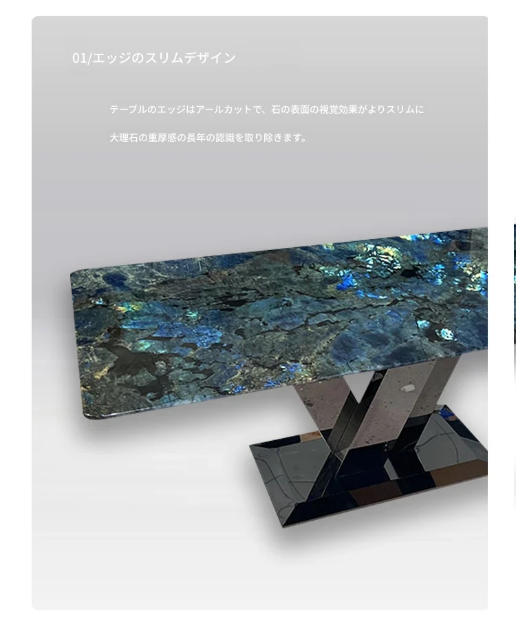 高級感あふれるブルージェイド大理石ダイニングテーブル - インポート天然石使用、デザイナーによる豪華なデザイン、ラグジュアリーな空間を演出する軽やかな高級ダイニングテーブル。
