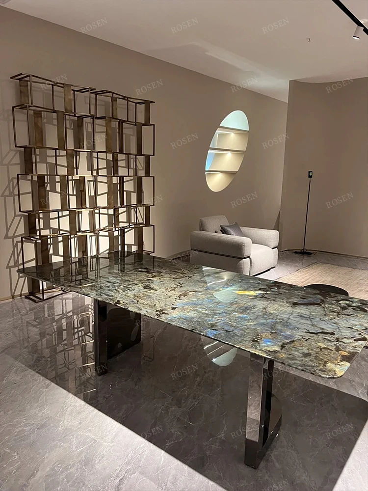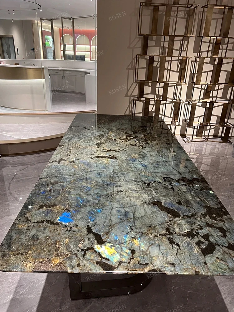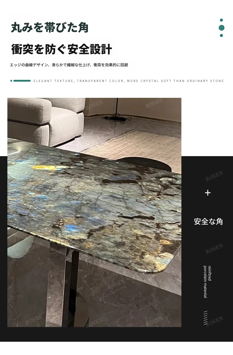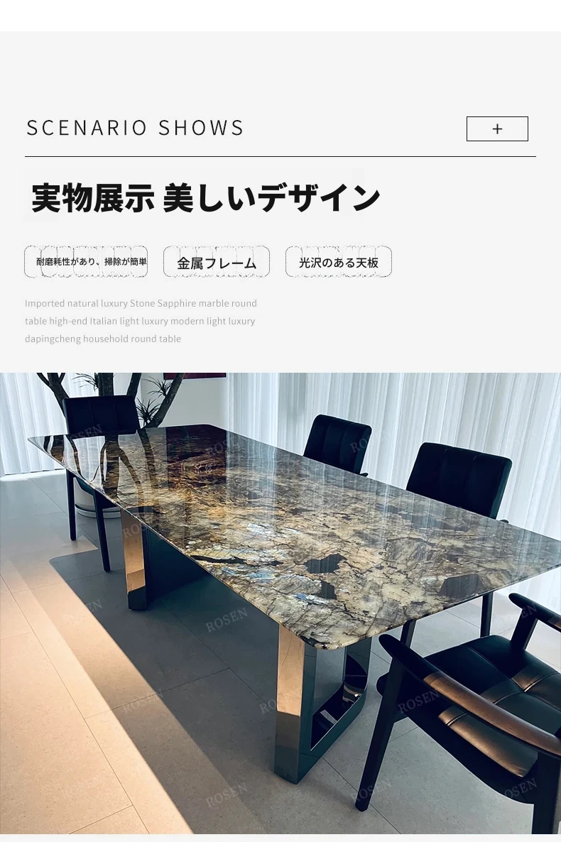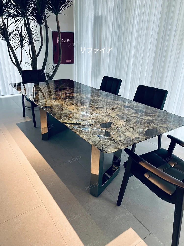 天然輸入の贅沢なラピスラズリの四角テーブル - デザイナーによるミニマルなデザインのサファイアダイニングテーブル。高級感溢れる天然素材で、洗練された食卓を演出します。あなたの空間を特別に彩る一品です!