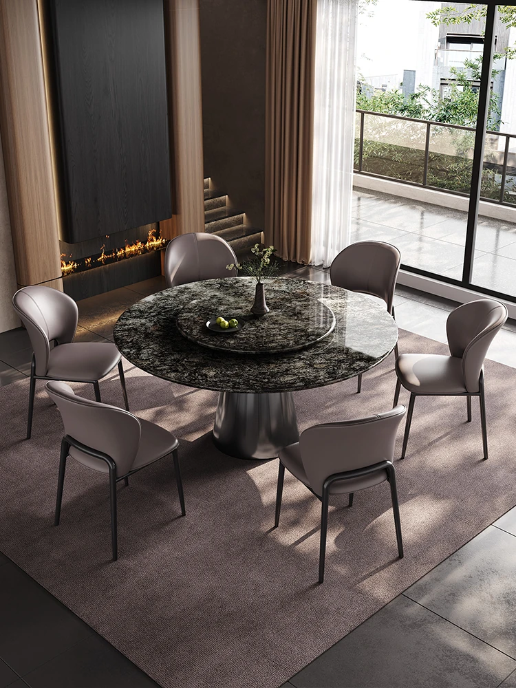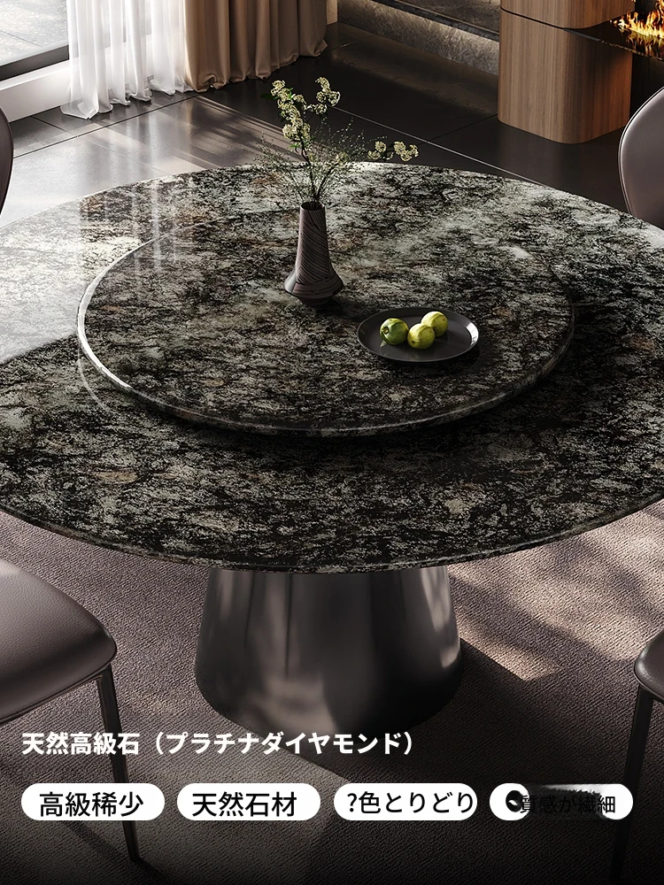 天然大理石ラウンドダイニングテーブル - インポートプラチナダイアモンドデザイン、2024年新作。ラグジュアリーな軽やかさを持つ家庭用円形テーブルと椅子のセットで、特別なディナーを演出します!