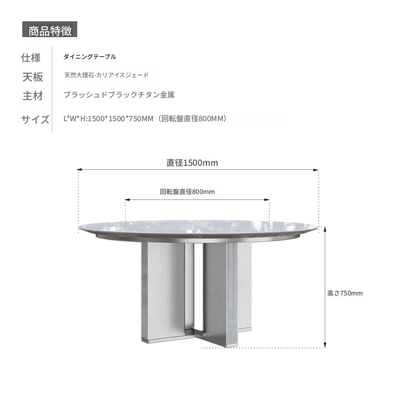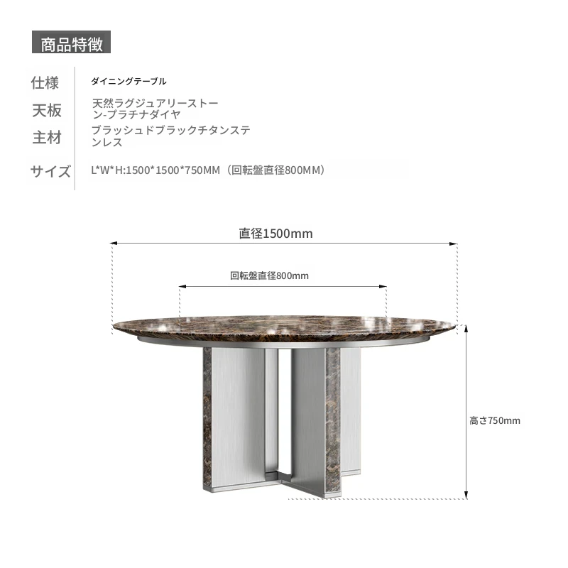 【ラグジュアリーストーン-プラチナダイヤモンド】1.5Mダイニングテーブル ブラックチタン金