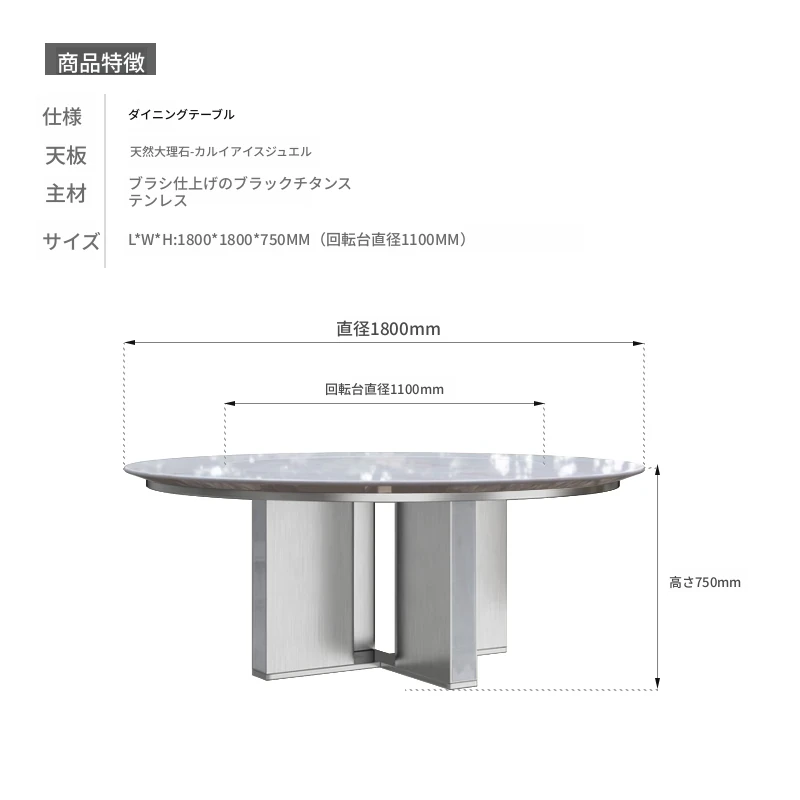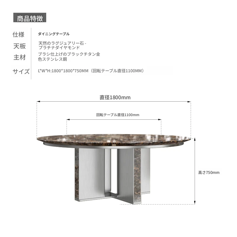 【ラグジュアリーストーン-プラチナダイヤモンド】1.8Mダイニングテーブル ブラックチタン金