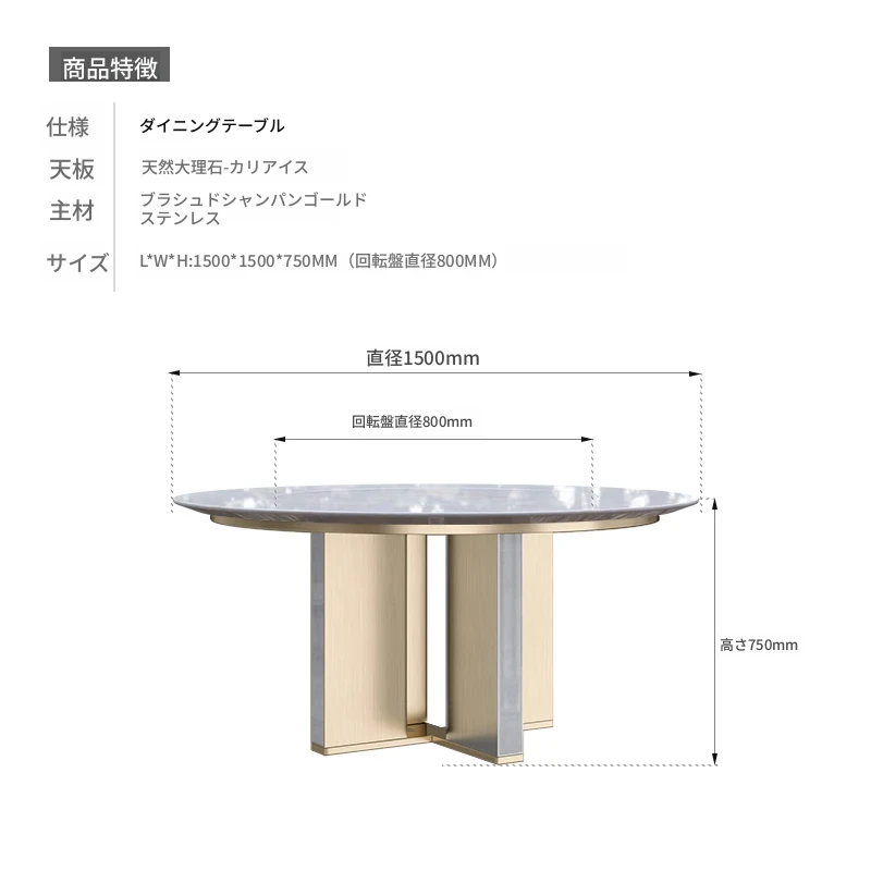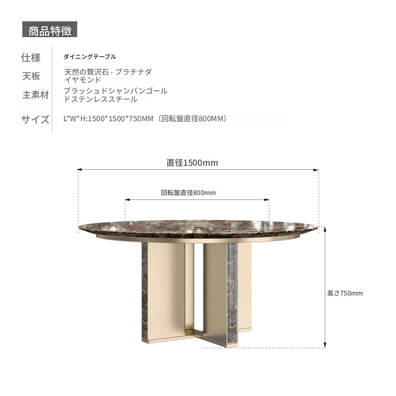 【ラグジュアリーストーン-プラチナダイヤモンド】1.5Mダイニングテーブル シャンパンゴールド