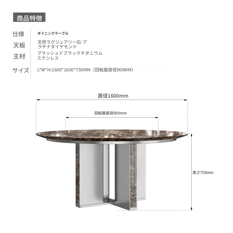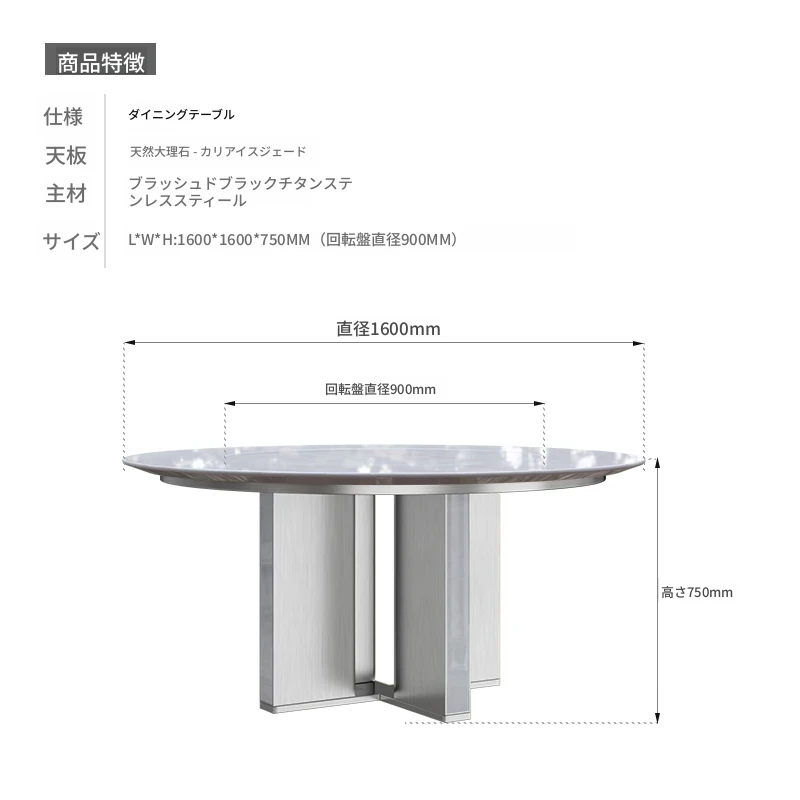 【ラグジュアリーストーン-プラチナダイヤモンド】1.6Mダイニングテーブル ブラックチタン金