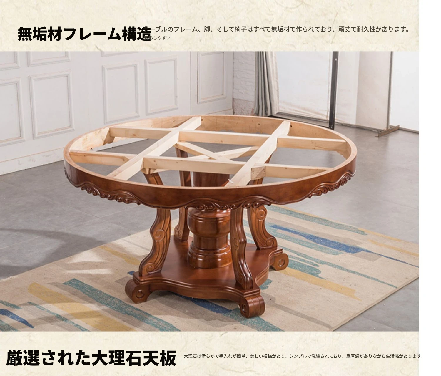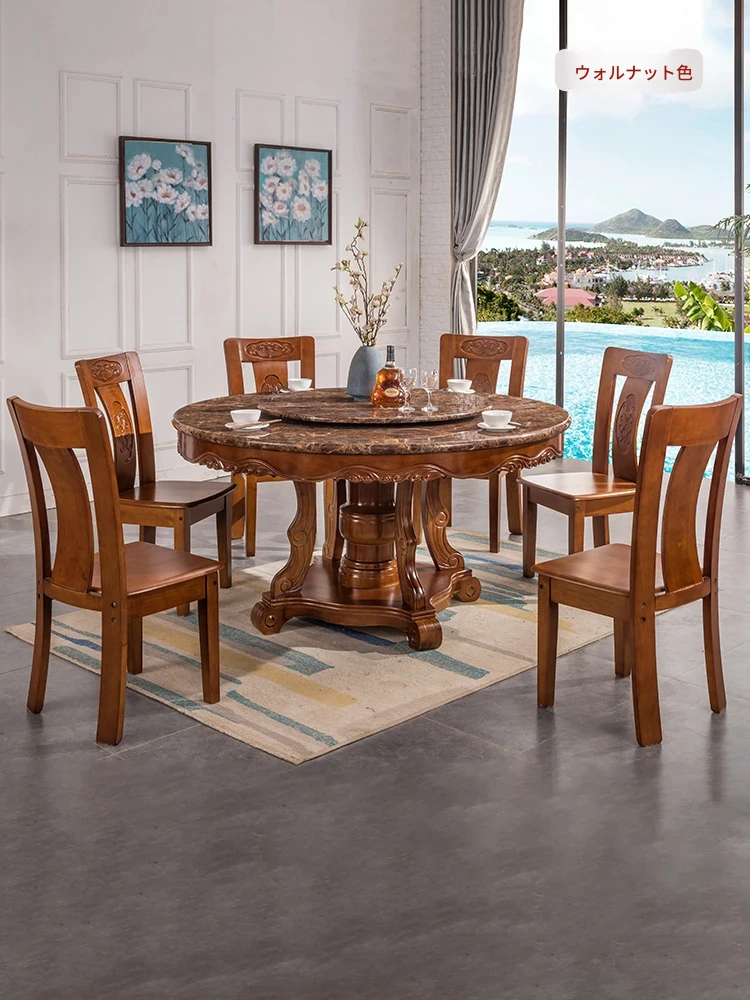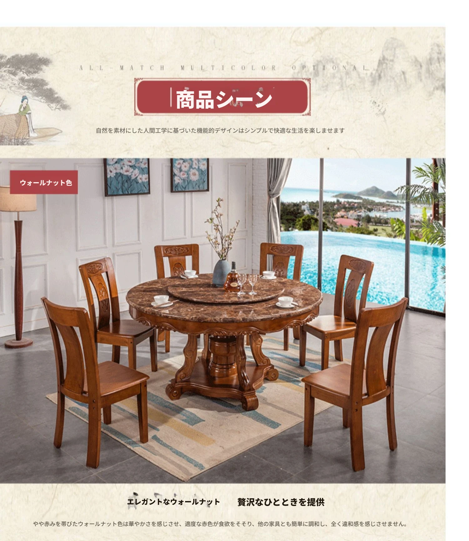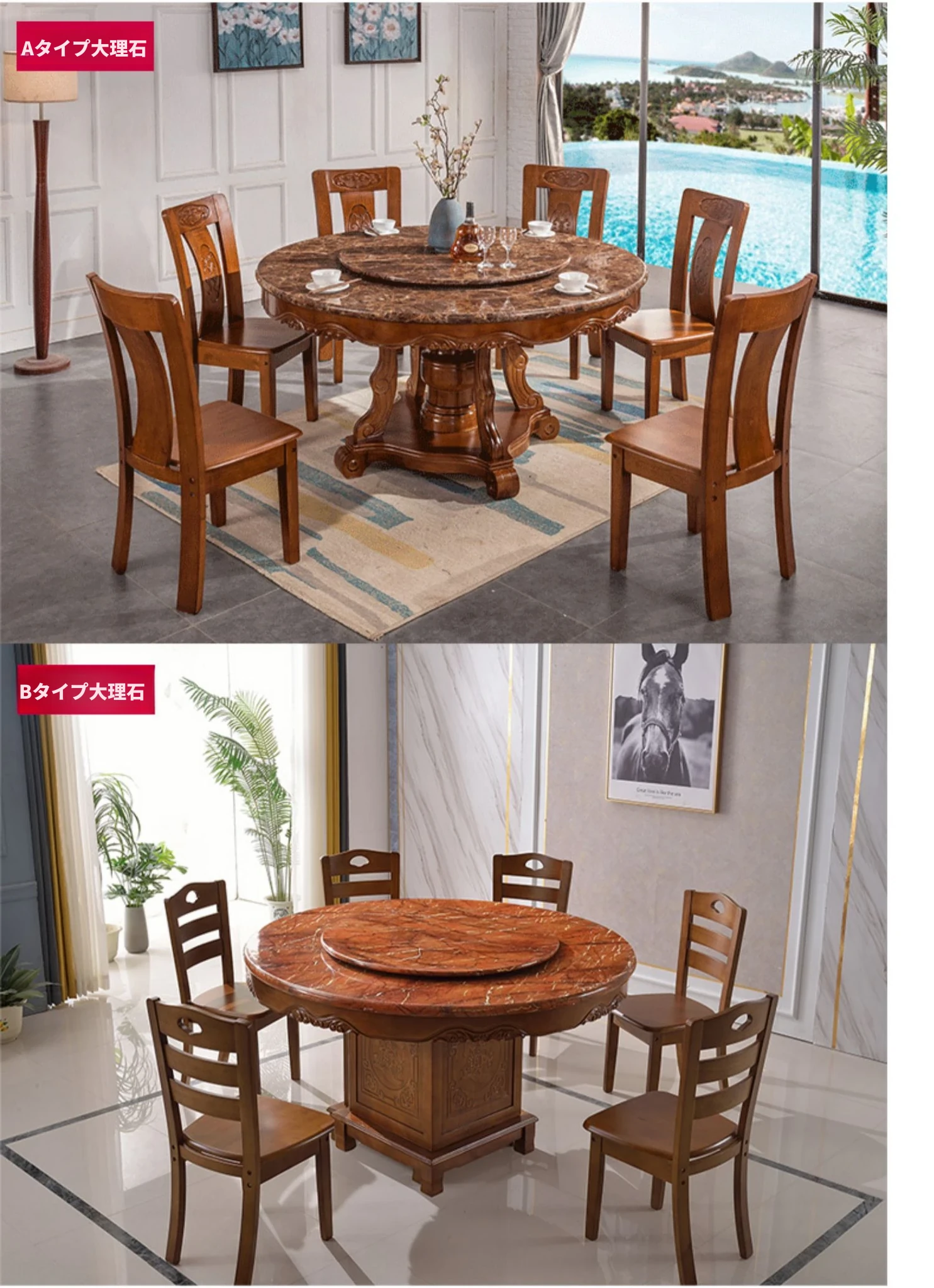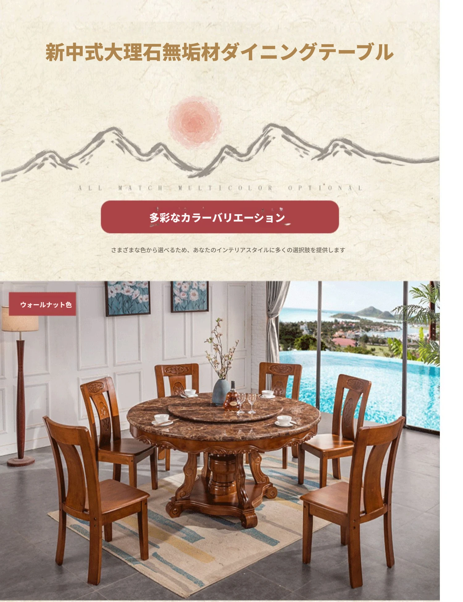 大理石の回転テーブル付きダイニングセット - おしゃれな丸型天然木製テーブルで、家族や友人との楽しい食事を演出!洗練されたデザインでお部屋を華やかに飾ります。
