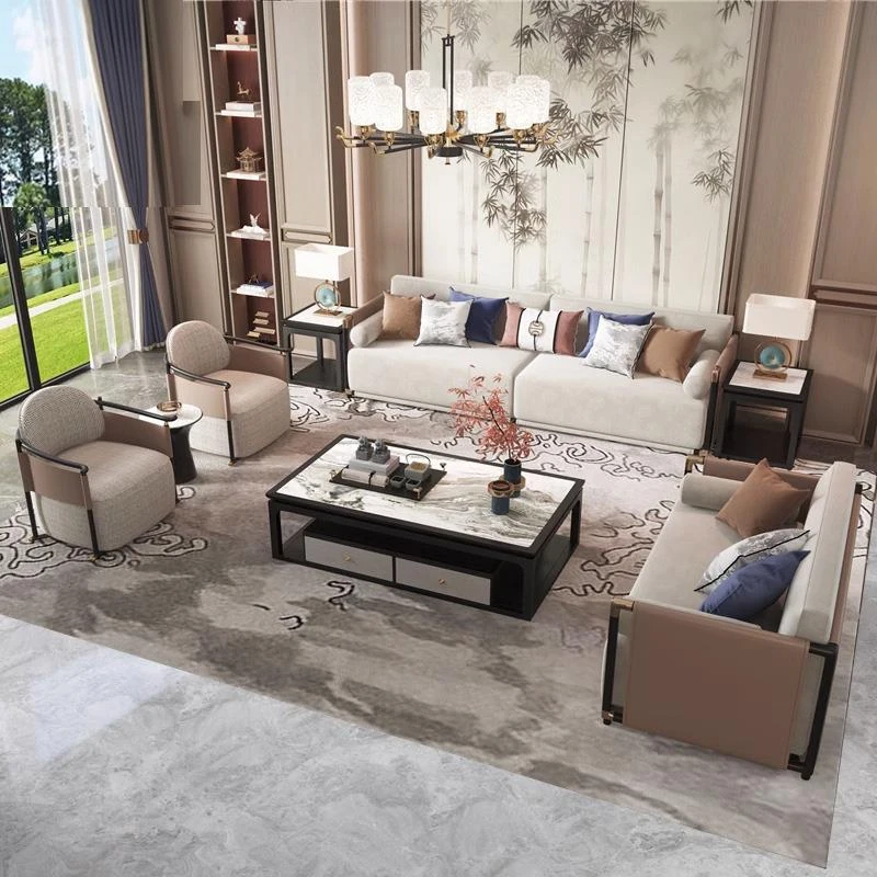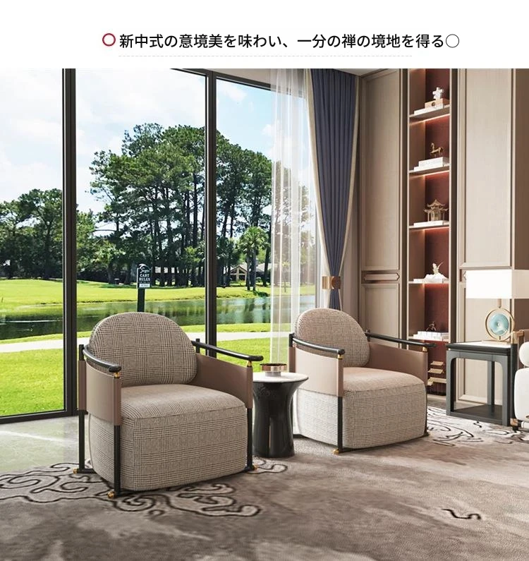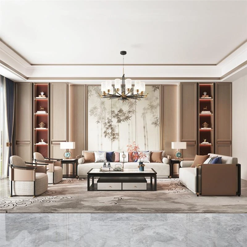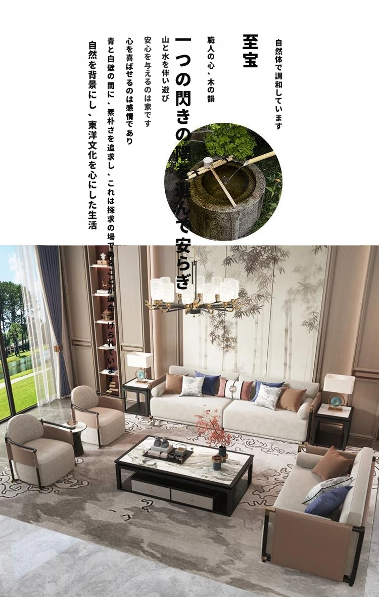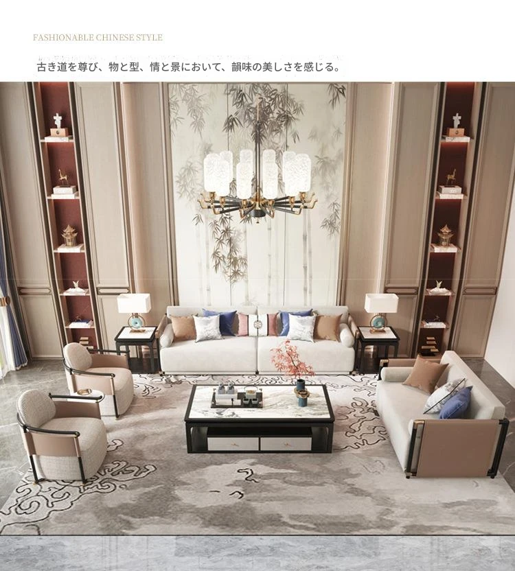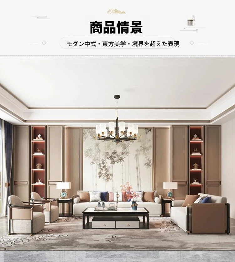 新中式スタイルの無垢材ソファセット|モダンでシンプルなデザイン、洗練されたファブリックとレザーの組み合わせ|大小様々なリビングルームにぴったりなサンプルハウス用家具!