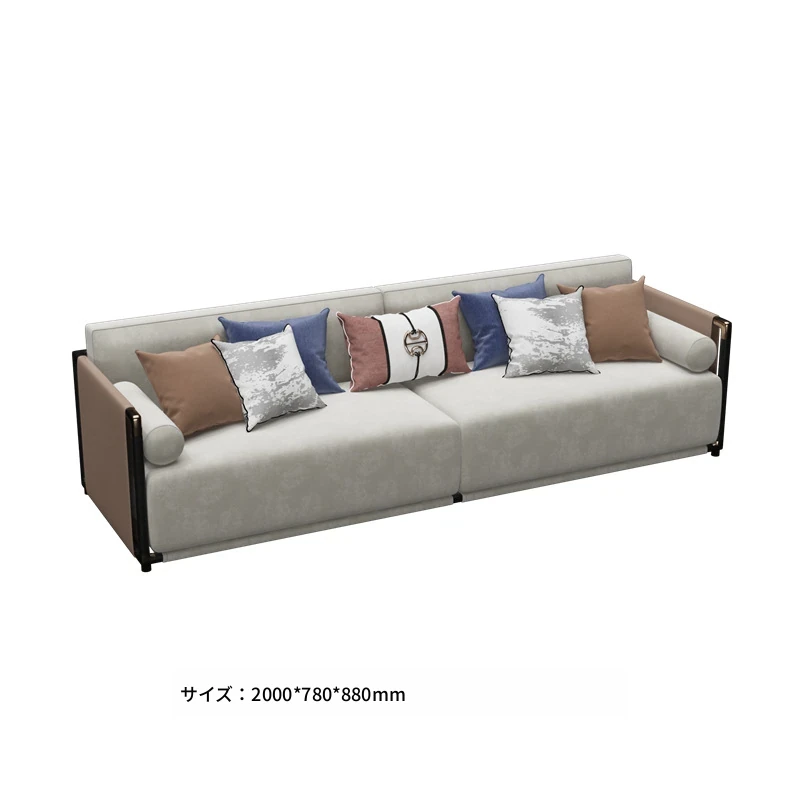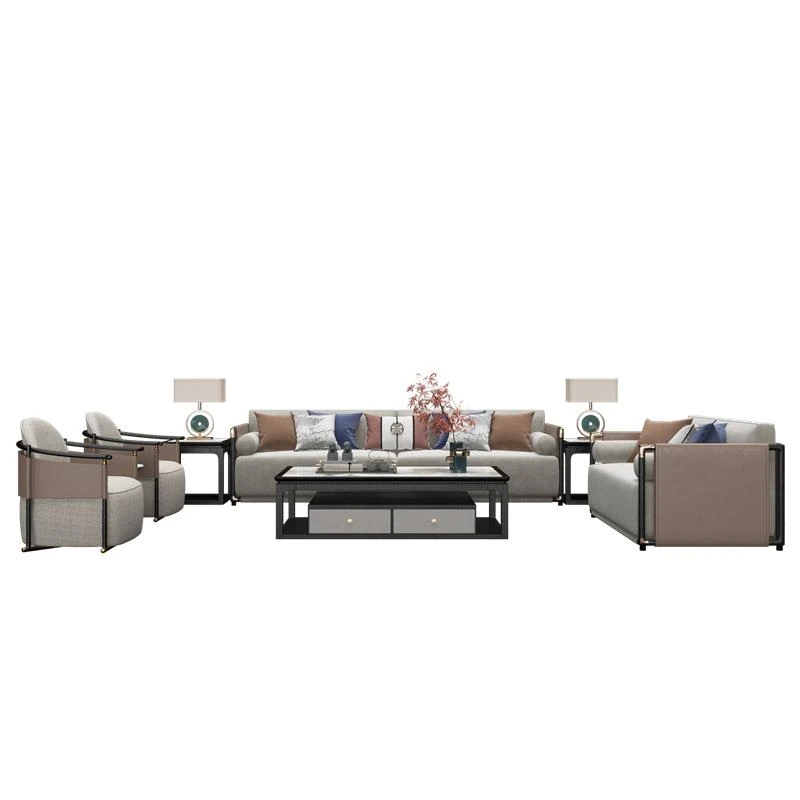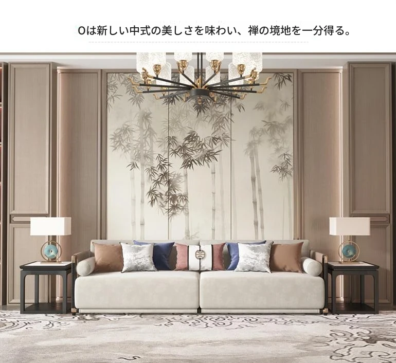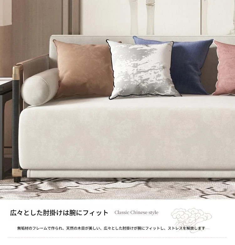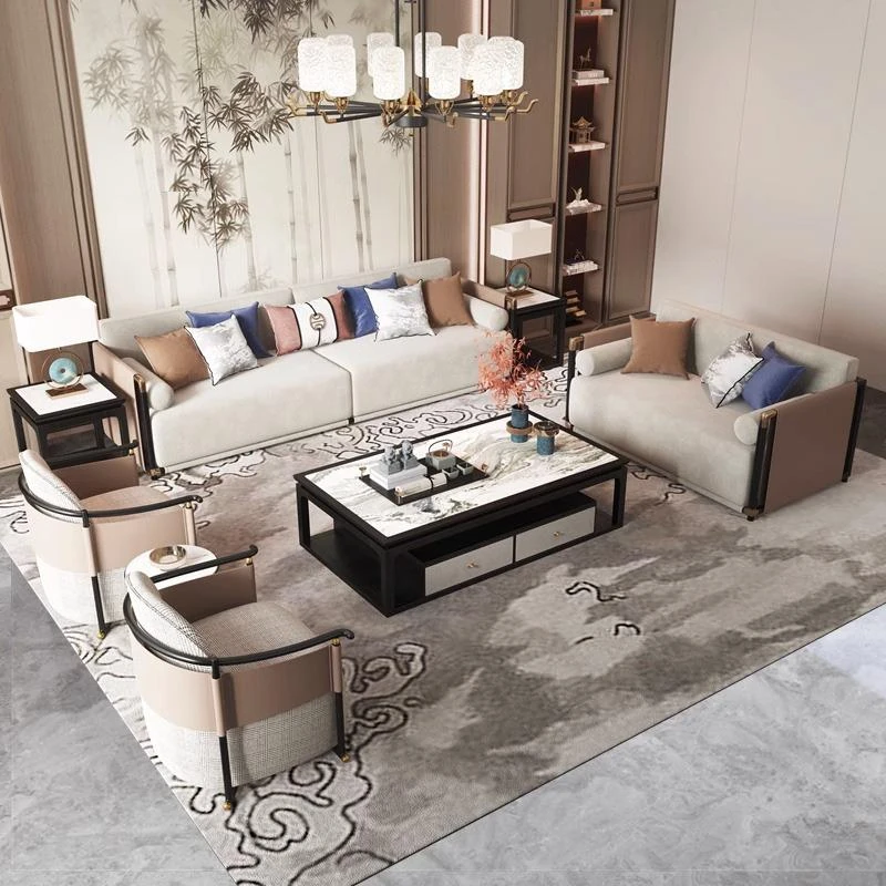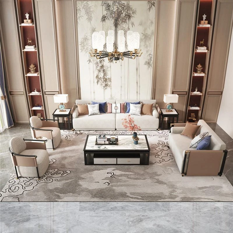 新中式スタイルの無垢材ソファセット|モダンでシンプルなデザイン、洗練されたファブリックとレザーの組み合わせ|大小様々なリビングルームにぴったりなサンプルハウス用家具!