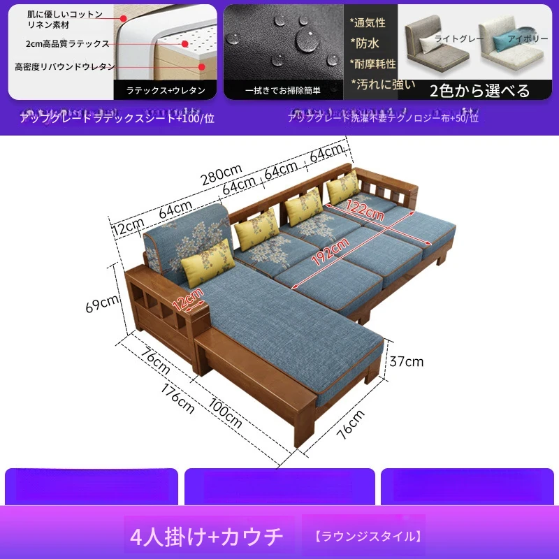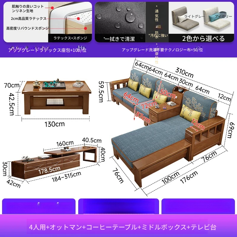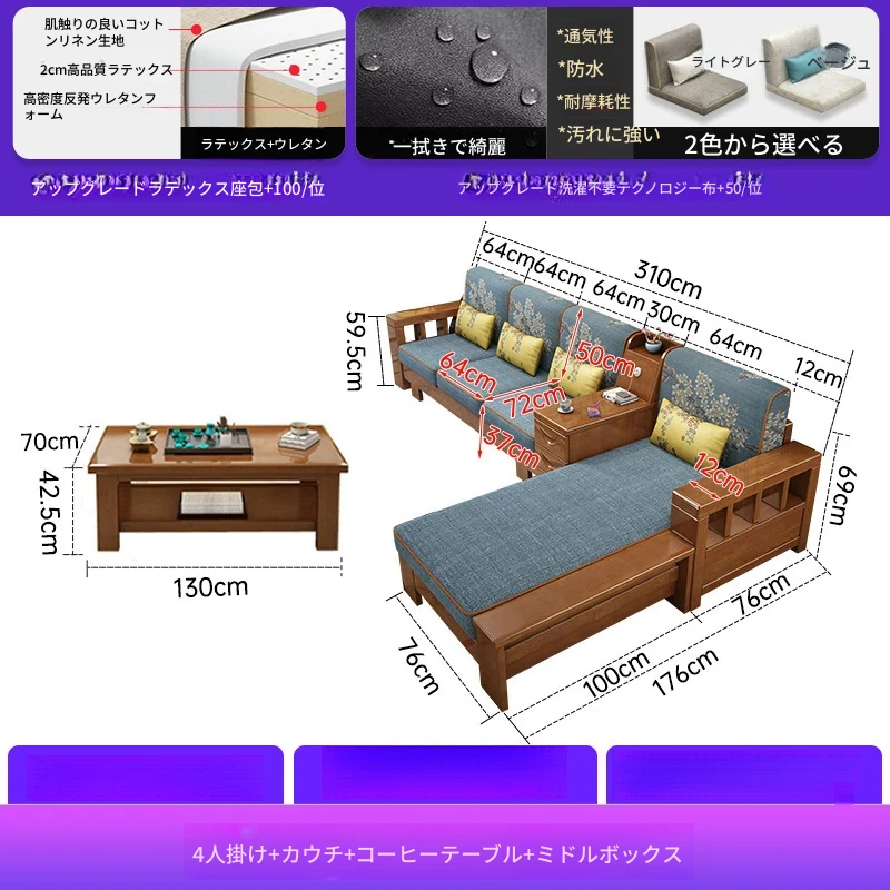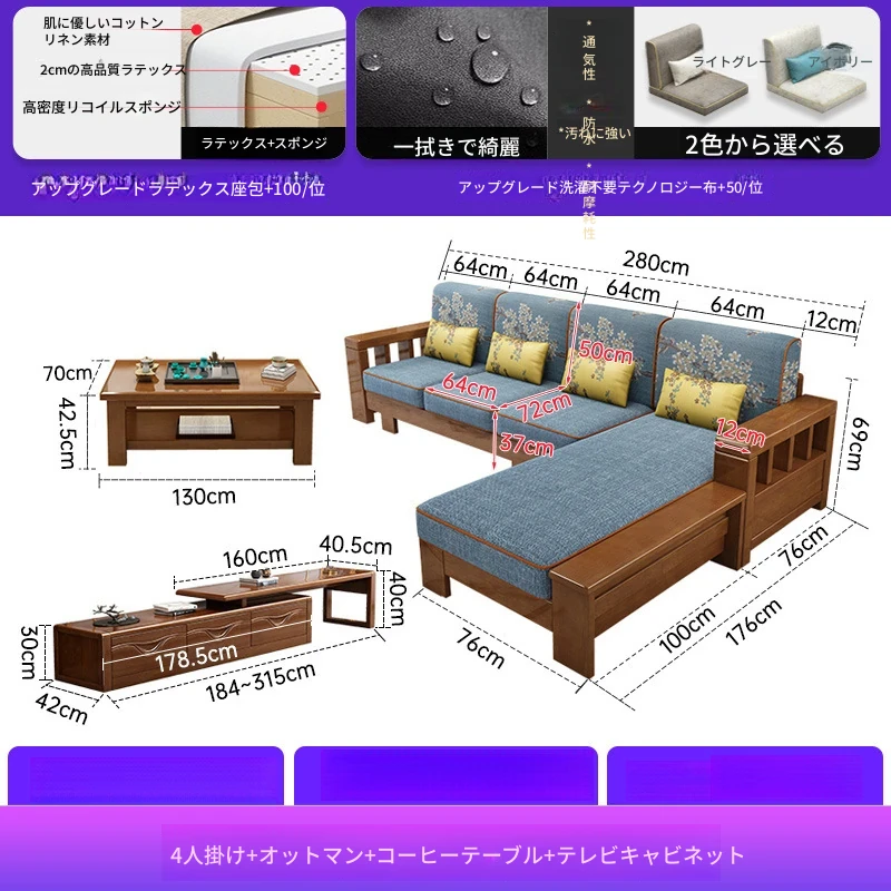 -4人用ソファ+貴妃椅+コーヒーテーブル+中型収納箱+テレビ台(長さ3.1メートル)