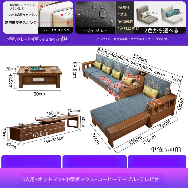 5人掛けソファ+貴妃椅+コーヒーテーブル+中型キャビネット+テレビ台(長さ3.74メートル)