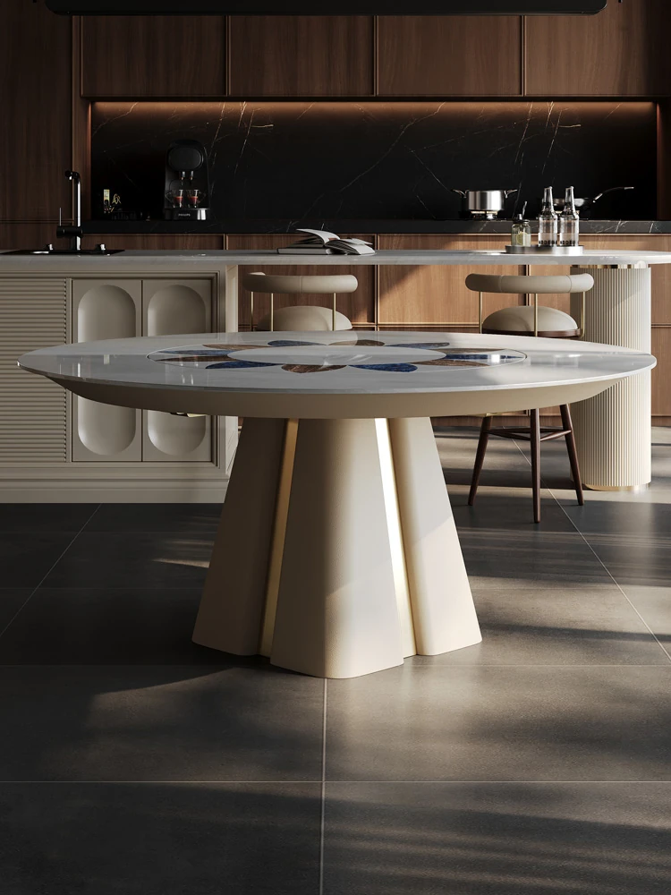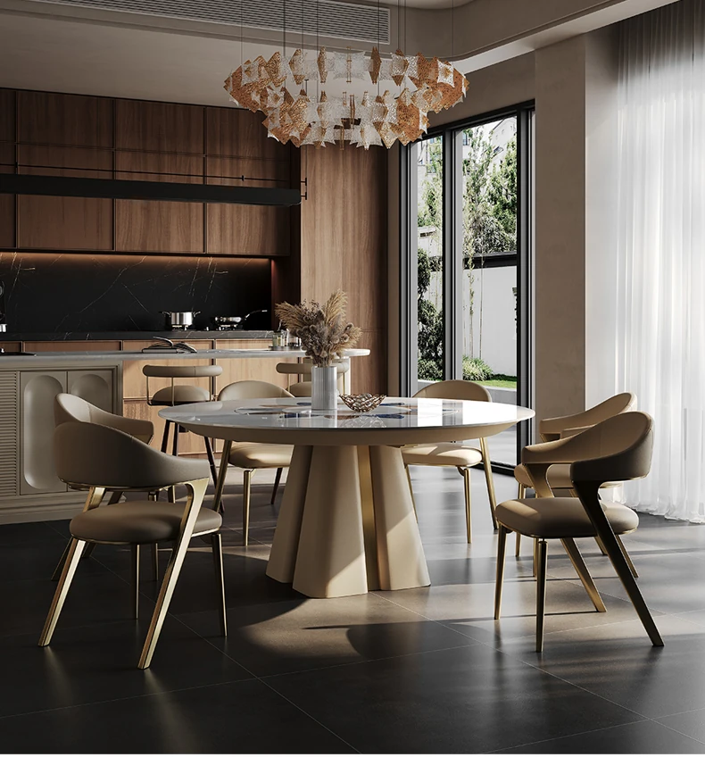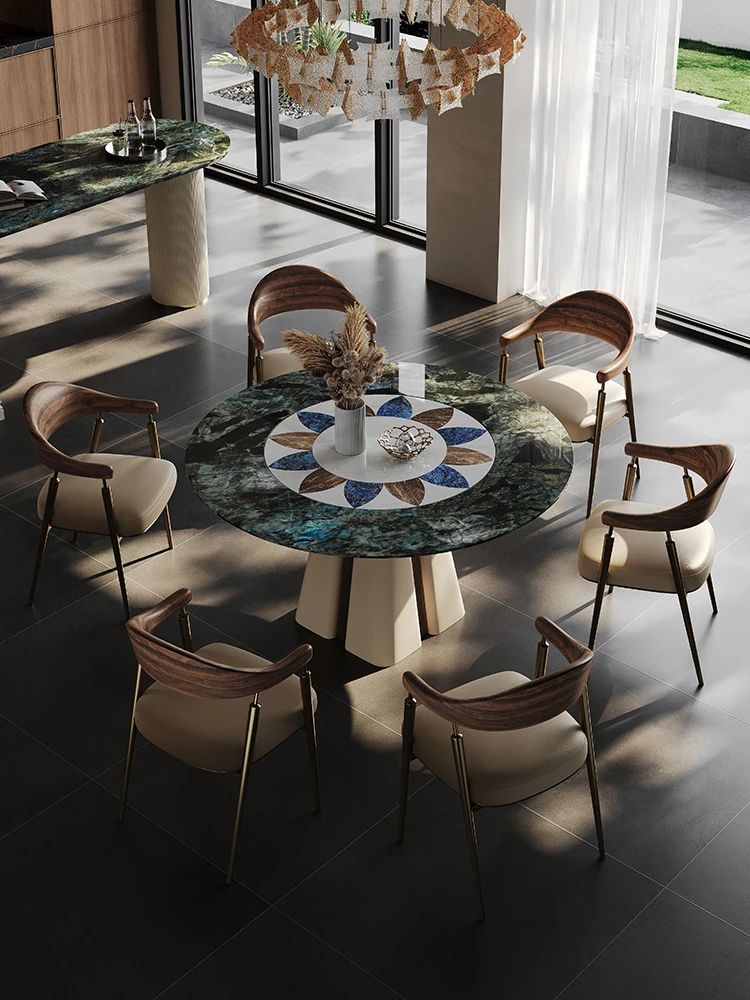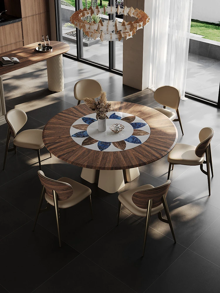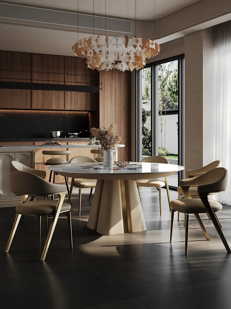 高級感あふれるモダンな大理石ダイニングテーブル&チェアセット - シンプルでエレガントな新作、温もりのある天然木風デザイン、ラウンド型でどんなインテリアにもマッチ!