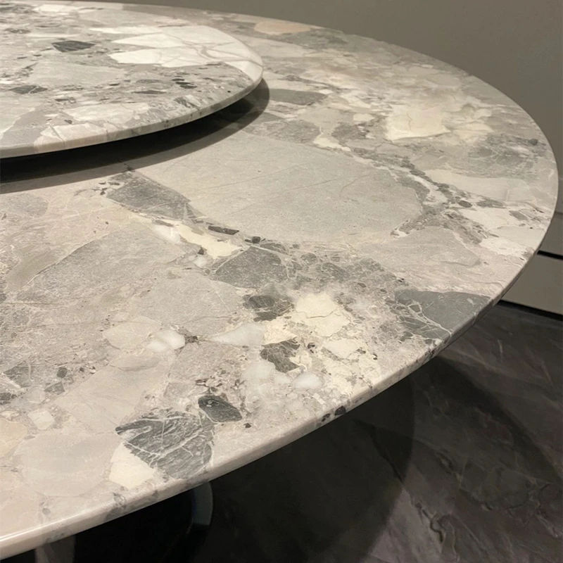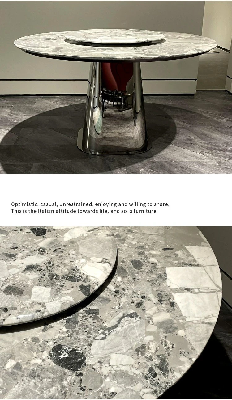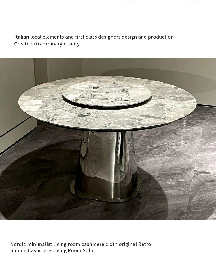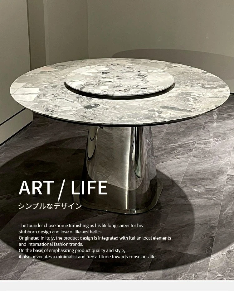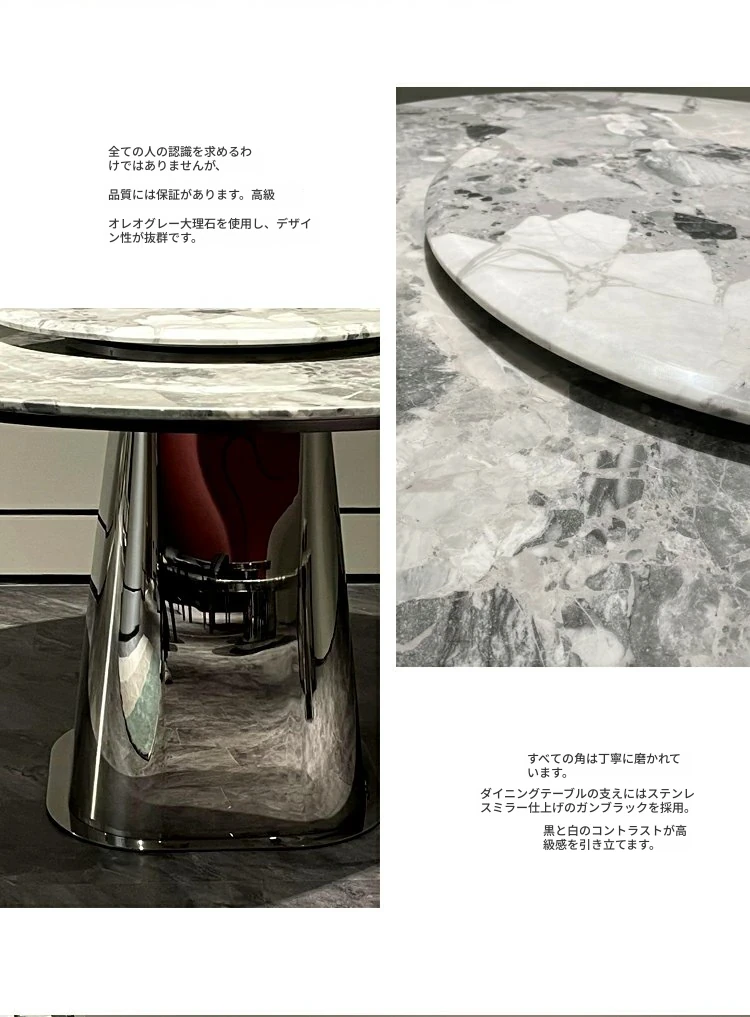 天然大理石のラウンドダイニングテーブル - オレオグレーの高級デザイン!モダンなイタリアンミニマリズムで、軽やかな贅沢を演出。おしゃれで洗練された空間をあなたの食卓に。