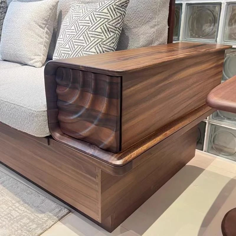新中式デザインの実木ソファ - ブラックウォールナット製、リビングにぴったりな小型収納ボックス一体型、スリムな3人掛け直線タイプで、スタイリッシュな空間を演出します!
