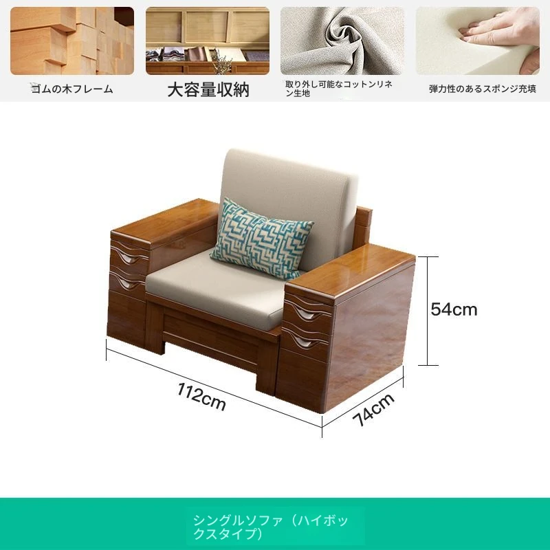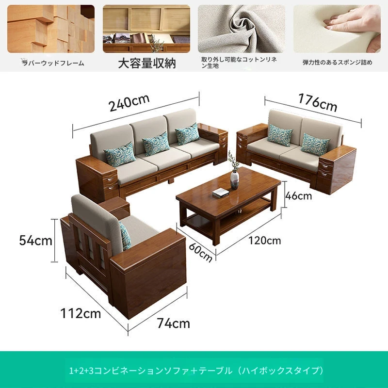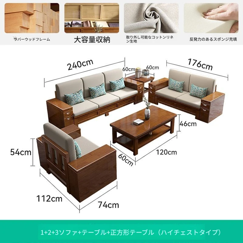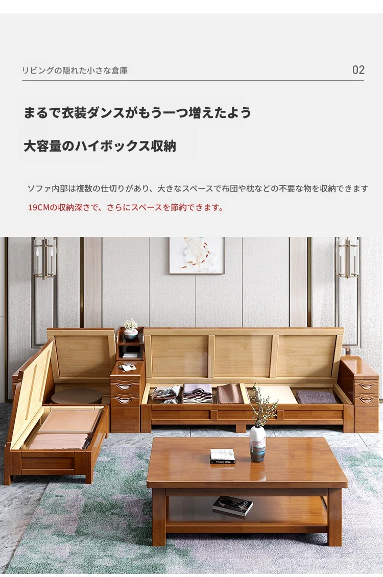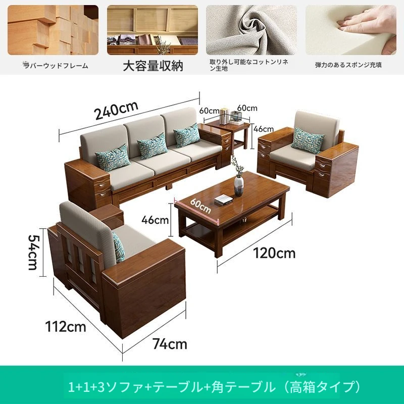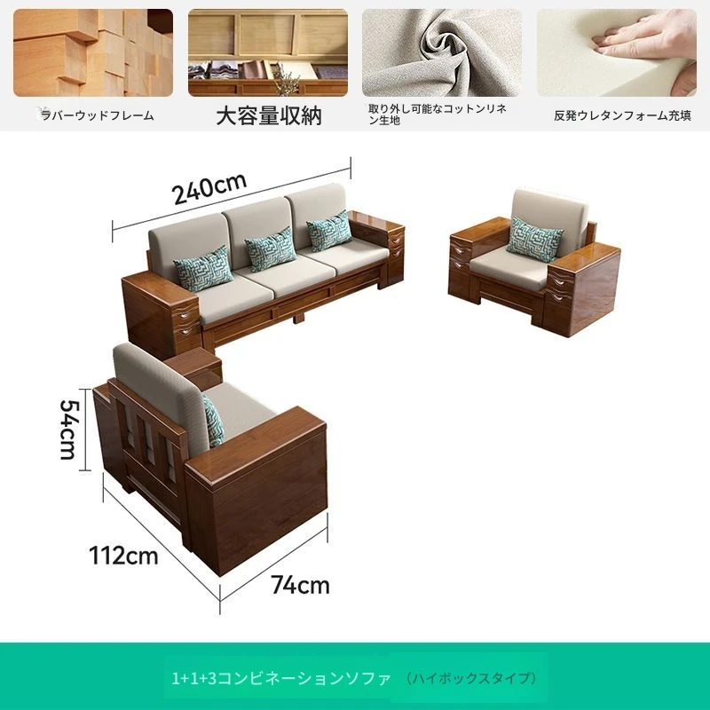 冬夏兼用の実木ソファセット|コンパクトな小型住宅に最適な新中式デザイン|高箱収納付きでスッキリ収納!木製家具で温もりのある空間を演出します。