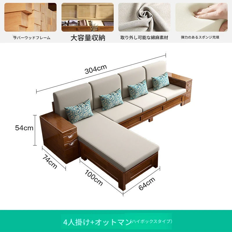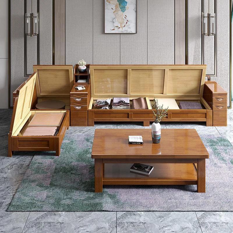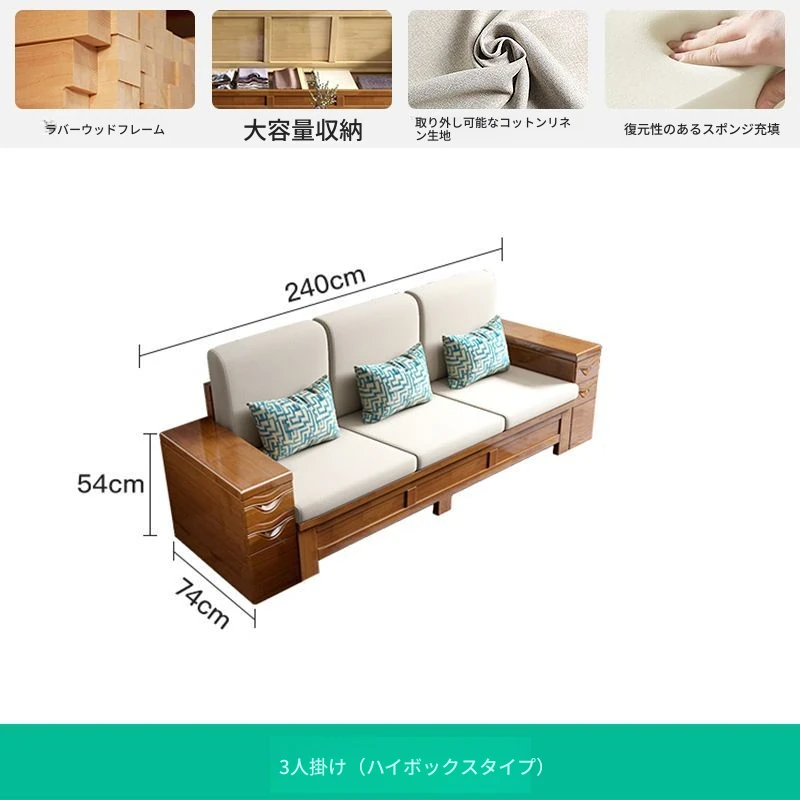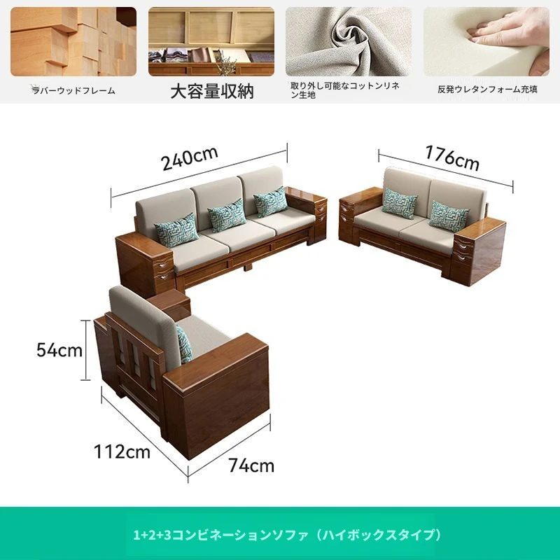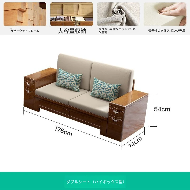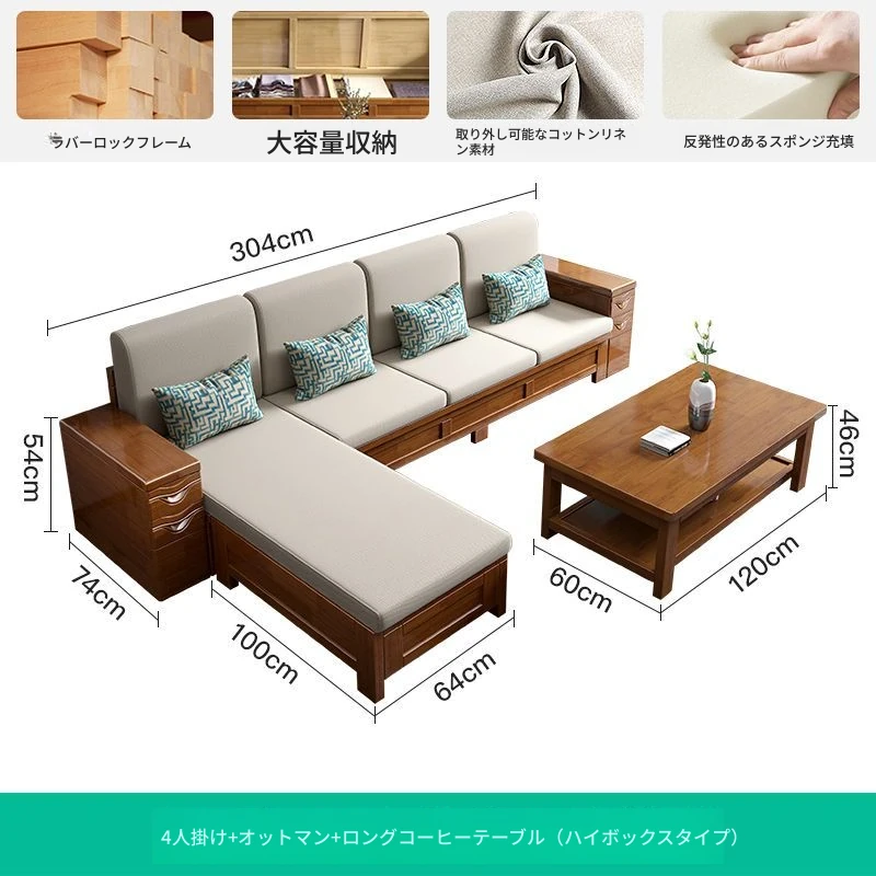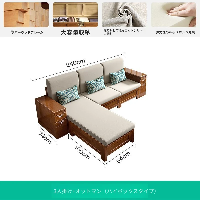 冬夏兼用の実木ソファセット|コンパクトな小型住宅に最適な新中式デザイン|高箱収納付きでスッキリ収納!木製家具で温もりのある空間を演出します。